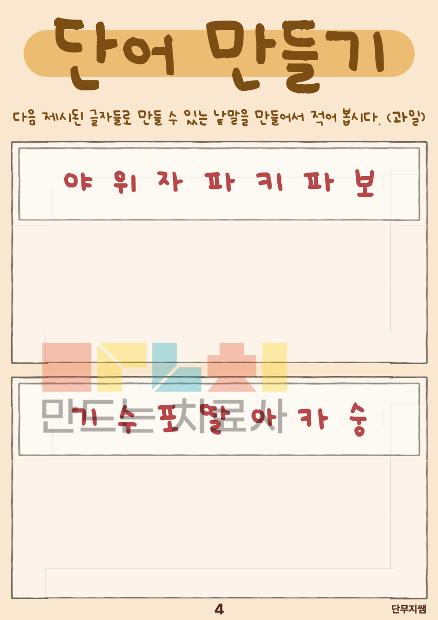 주어진 글자를 조합하여 새로운 단어를 만들어 보는 활동을 통해 언어적 사고와 인지적 조직 능력을 동시에 자극하고, 스스로 생각하고 완성하는 경험을 통해 자신감과 과제 수행 지속력을 기르는 것을 목표로 합니다.