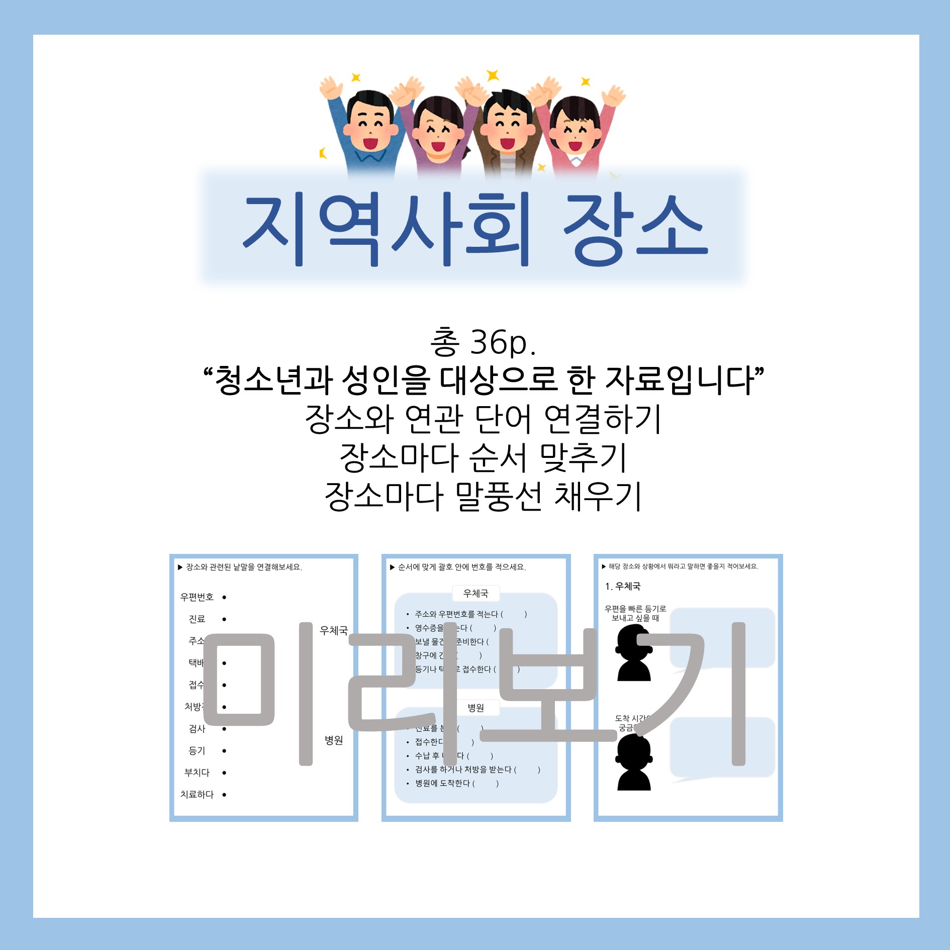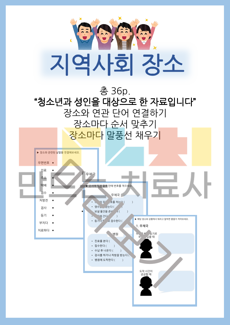 “청소년과 성인을 대상으로 한 자료입니다” 장소와 연관 단어 연결하기 장소마다 순서 맞추기 장소마다 말풍선 채우기