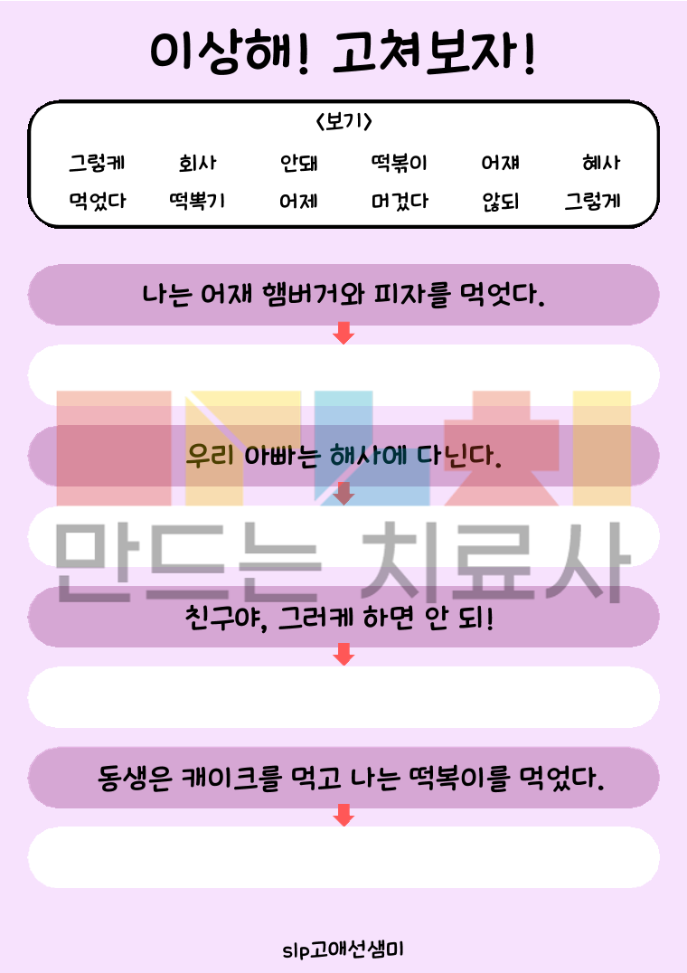 아이들이 많이 헷갈려하는 맞춤법을 판단하고 수정하는 과제 입니다. 보기에서 맞는 표현을 찾아 적을 수 있는 쉬운 단계와 보기 없이 스스로 판단하여 수정해보는 어려운 단계로 구성되어있어 아동의 수준에 맞게 사용 가능합니다.