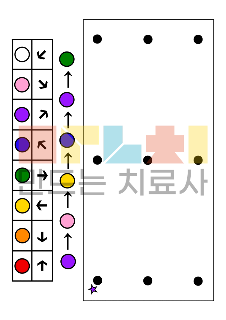 가로형태의 페이퍼입니다. 색이 칠해진 원형을 순서대로 보고 그 원형의 색이 가지고 있는 화살표의 방향대로 밑에 점들을 선으로 연결하면 됩니다.