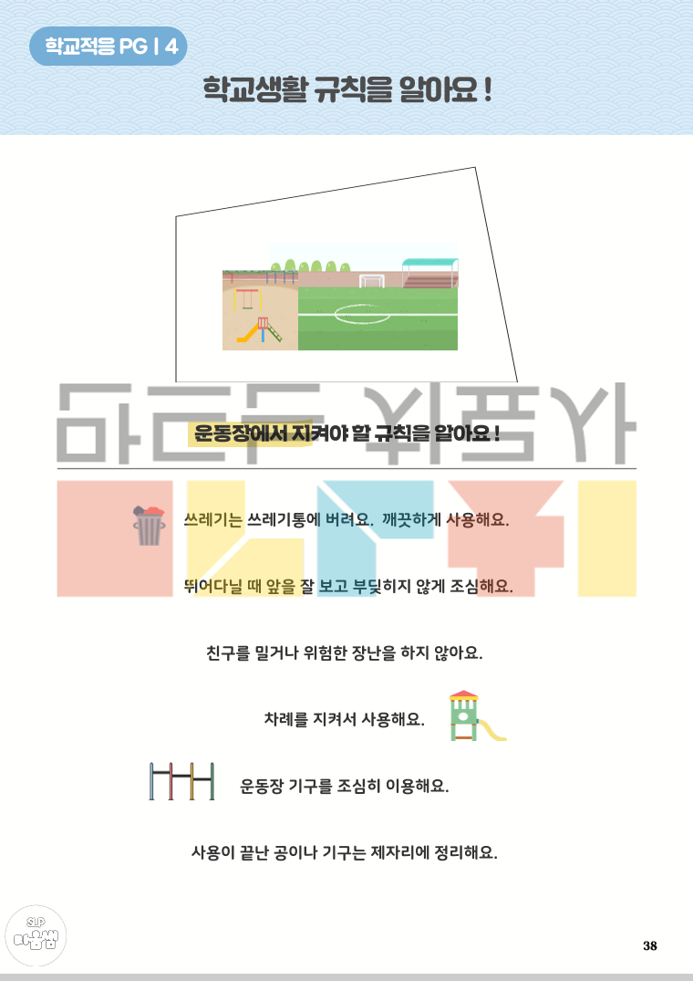 <학교적응PG 구성> 1. 새해에 무엇이 달라질까요? 2. 다양한 장소와 장소별 사물을 알아요 3. 각 장소에서 무엇을 할까요? 4. 이 장소에서 어떻게 해야 할까요(규칙) 5. 학교 일정을 알아보아요 6. 나의 하루 일과를 알아요 7. 이 상황에서 어떻게 해야 할까요(감정/대처) 8. 나의 강점과 약점을 알아요 <어떻게 리뉴얼되었나요?> 1. 활동 구성 보안 - 보다 다양한 학교 환경을 경험할 수 있도록 활동 구성을 확장 - 학교생활과 관련된 다양한 이야기 상황을 제시하고, 각 상황에 대한 구체적이고 단계적인 대처 방법을 학습할 수 있도록 구성 - 아동의 강점과 어려움을 함께 탐색하고, 이를 바탕으로 한 대처 연습을 통해 실질적인 학교 적응을 지원 2. 학교 현장 흐름 반영 - 최근 학교 운영 흐름을 반영하여 방과후학교 및 돌봄교실 관련 활동 새롭게 추가 3. 어휘 구성 강화 - 학교 적응에 필수적인 핵심 어휘를 보다 풍성하고 체계적으로 포함 (학교 내 장소·사물, 학교 규칙, 생활 표현 등) 4. 시각 자료 개선 - 기존보다 현실과 유사한 표현의 그림체를 적용하여 아동이 실제 학교 상황을 보다 쉽게 이해하고 몰입할 수 있도록 함 - 전반적인 그림체의 통일감과 완성도를 높임