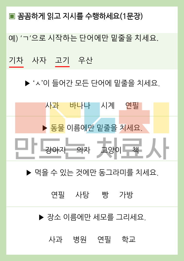 성인과 청소년 대상 1~3문장 읽고 이해하여 지시를 수행하는 활동지입니다!