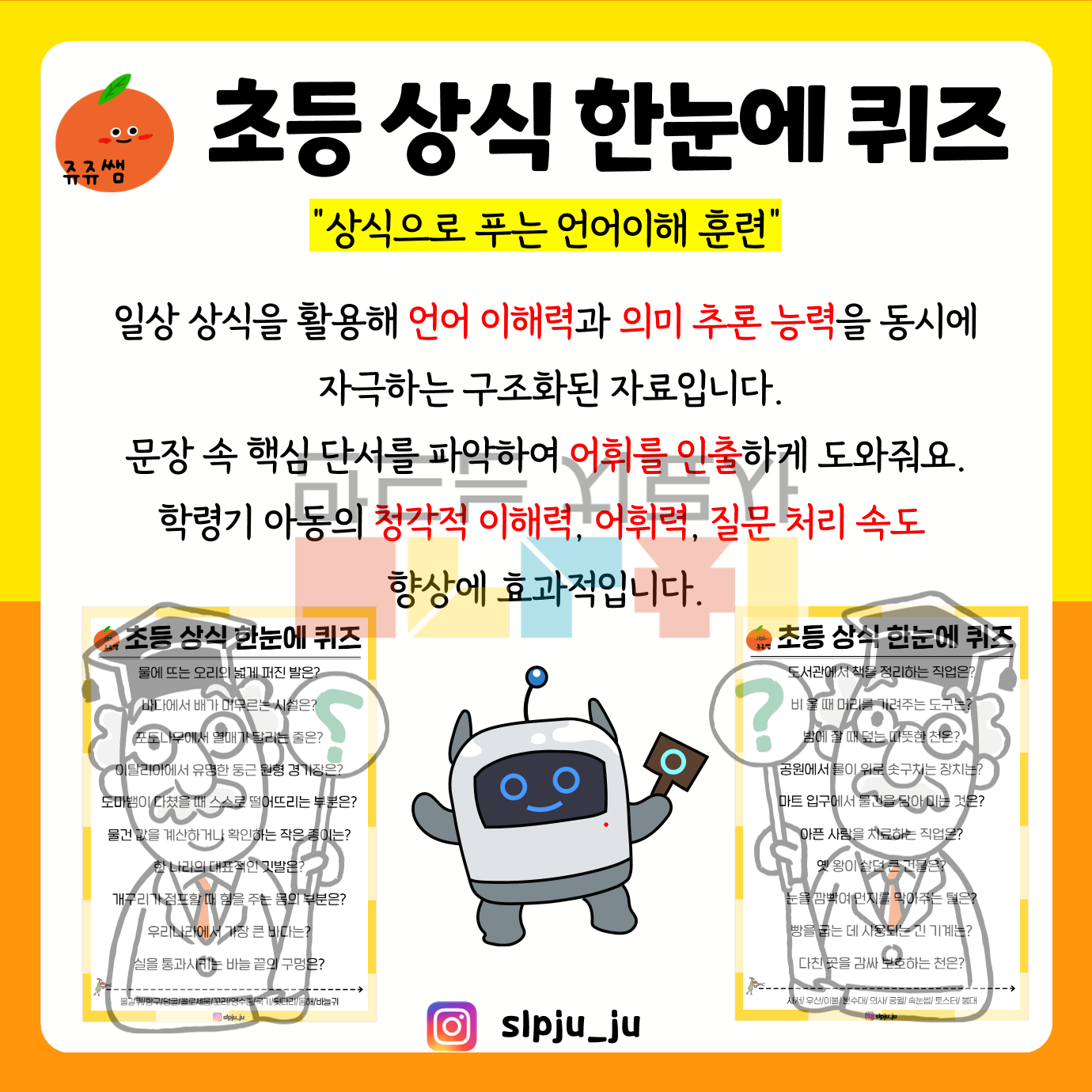 안녕하세요 쥬쥬쌤입니다. 일상 상식을 활용해 언어 이해력과 의미 추론 능력을 동시에 자극하는 구조화된 자료입니다. 문장 속 핵심 단서를 파악하여 어휘를 인출하게 도와줘요. 학령기 아동의 청각적 이해력, 어휘력, 질문 처리 속도 향상에 효과적입니다.