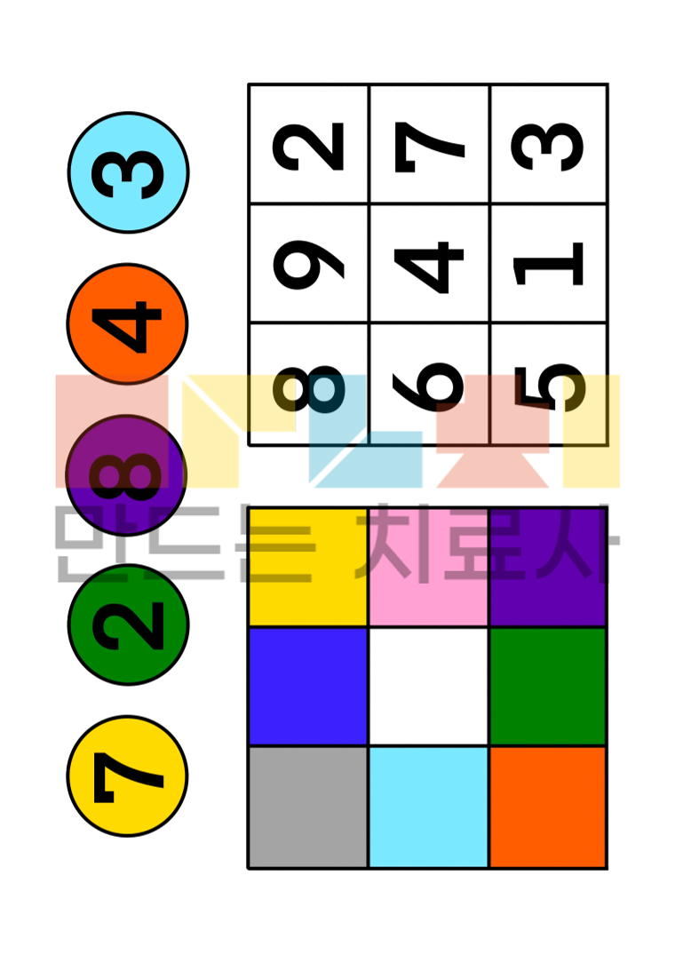 양손협응, 눈손협응을 위한 가로 형태의 페이퍼입니다. 제시된 원형 속 숫자와 색을 왼손, 오른손으로 동시에 찾으면 됩니다.