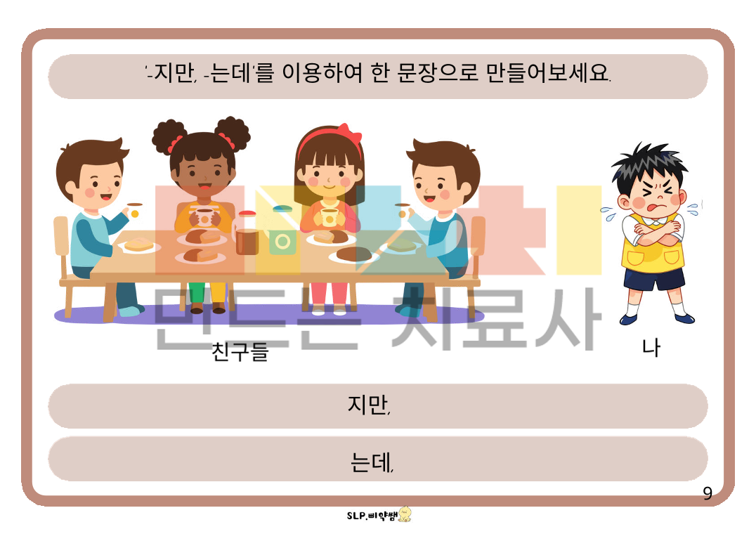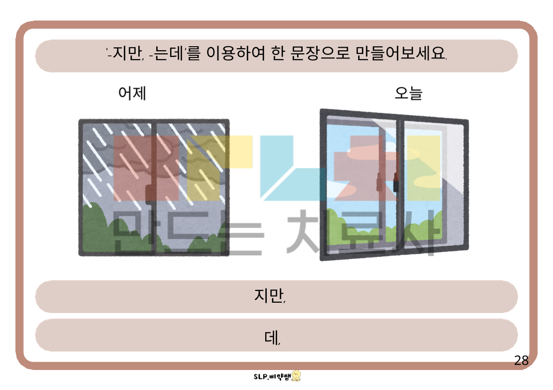 단문을 연결하는 연결어미 중 대등적으로 연결할 때 쓰이는 연결어미 입니다. 종속적 표현보다 쉬워서 어렵지 않게 접근할 수 있습니다. # 대상: -단문 위주로 사용하는 아동. -연결어미를 쓰지만, "-고"만 사용하는 아동. - 일상 대화에서 문장 사용이 매끄럽지 않아 내용 전달이 잘 안되는 아동. -읽고 쓰기가 되지 않아도, 그림을 보며 대화 형식으로 가능한 아동. #내용: 반대말 위주의 형용사 연결 ("00은 크지만, 00은 작아요, 00은 깨끗한데 00은 더러워요." 등) 동사 연결 ("00은 가는데, 00은 안 가요, 00은 먹지만, 00은 안 먹어요." 등) 시제표현이 포함된 연결("어제는 00 했지만, 오늘은 00해요, 지금은 00하는데, 나중에는 00할 거예요." 등) #사용 팁: -단계별로 쉬운 형용사 연결->동사 연결->시제 표현 포함 연결 과 같이 나누어서 진행. -읽고 쓰기 가능한 아동은 말도 해보고, 직접 쓰면서 다 감각을 활용하여 익히기. -읽고 쓰기가 안 되는 아동은 "1번 그림 단문 만들기+2번 그림 단문 만들기 => 2문장 연결해서 복문으로 연결하기" 과정을 통해 말하며 익히기.