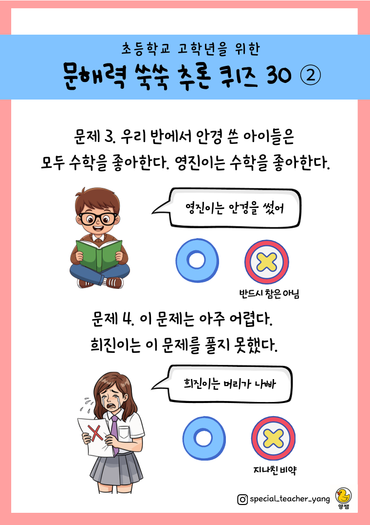 알쏭달쏭 추론 퀴즈를 풀어보며 문해력과 논리를 한번에 잡을 수 있습니다. 완벽하게 맞으면 o 맞을수도 아닐수도 있으면 x 입니다