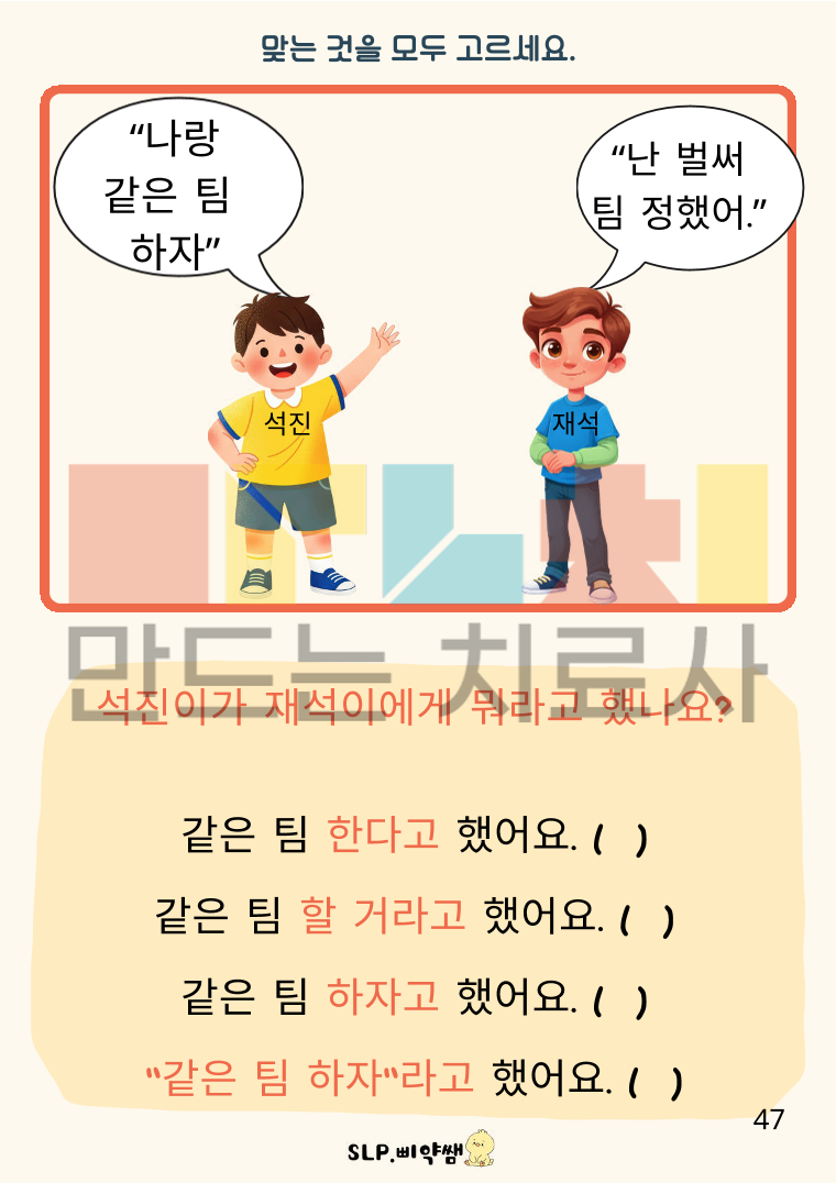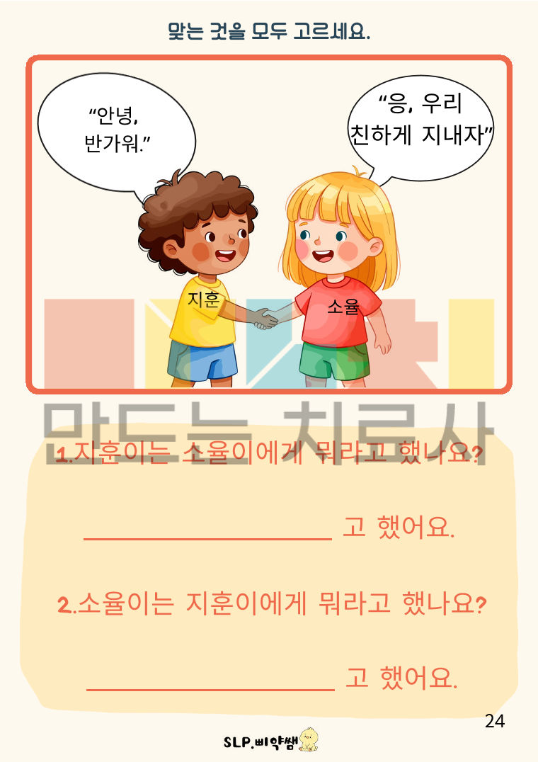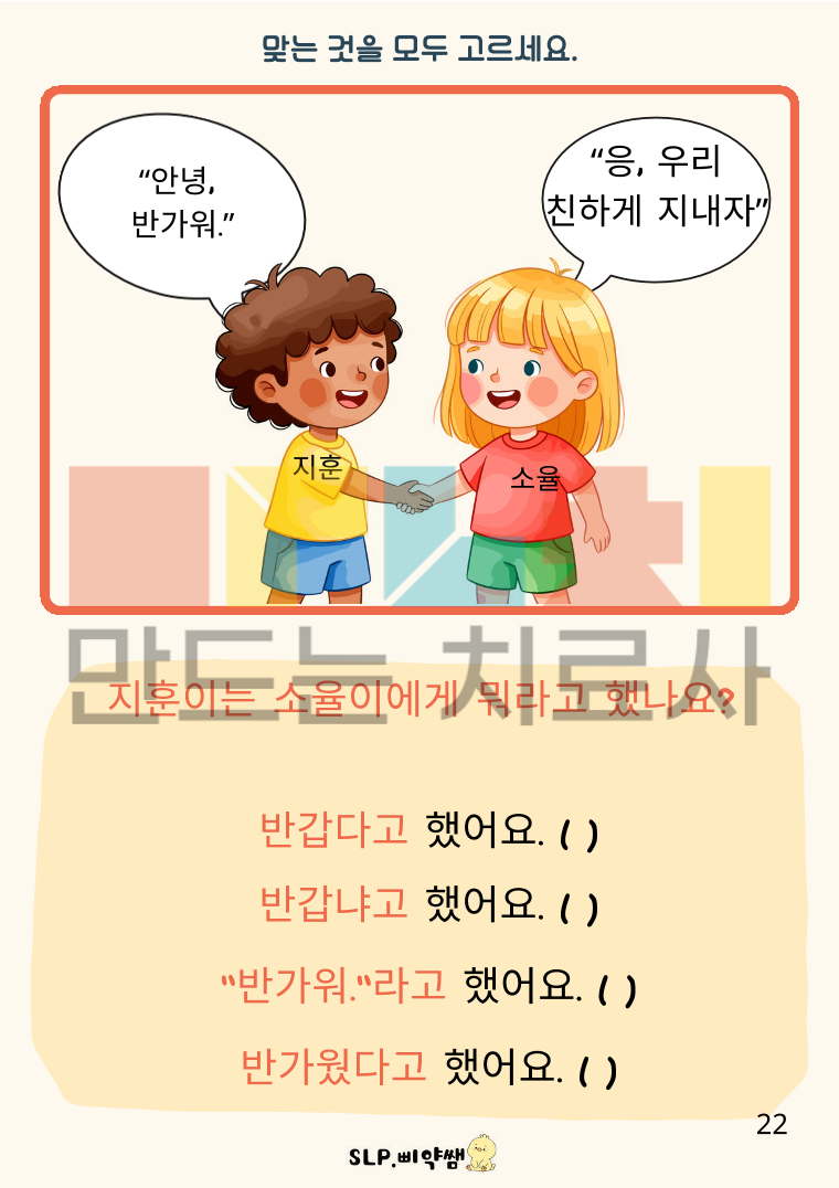 다른 사람이 한 이야기를 전달하는 방식에는 직접 인용과 간접 인용이 있지요. 직접 인용은[ "엄마가 밥 먹어."라고 했어.]와 같이 전달하면 되니 아이들이 비교적 잘 이야기 합니다. 반면, 간접 인용은 평서문, 의문문, 명령문, 청유문에 따락 '-다고, -냐고,-라고, -자고'와 같은 표현을 써서 활용해야 하므로 전달하기 어려워하는 아동들이 있습니다. SLP가 말 한 직후 "선생님이 뭐라고 했지?"라고 물어도 잘 대답하지 못하는 경우가 많습니다. (여기서는 주의집중 문제로 대답 못하는 아동들 대신 인용절 사용이 어려운 아동들을 예로 든 것입니다. 단, 주의 집중에 문제가 있는 아동들도 듣기 연습을 하면서 주의집중 및 인용절 사용을 훈련해도 좋습니다.) 글을 읽지 못하는 아동들은 SLP가 그림을 보여주며, 역할극처럼 대사를 읽어준 후 듣고 대답하는 형식으로 하면 더 재미있는 연습이 됩니다 ^^