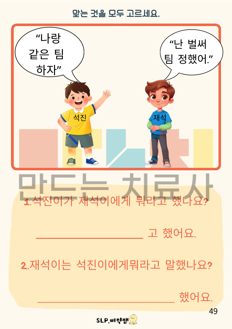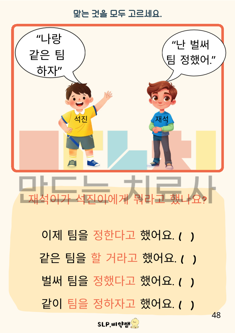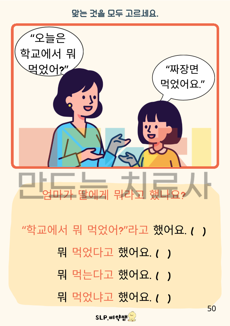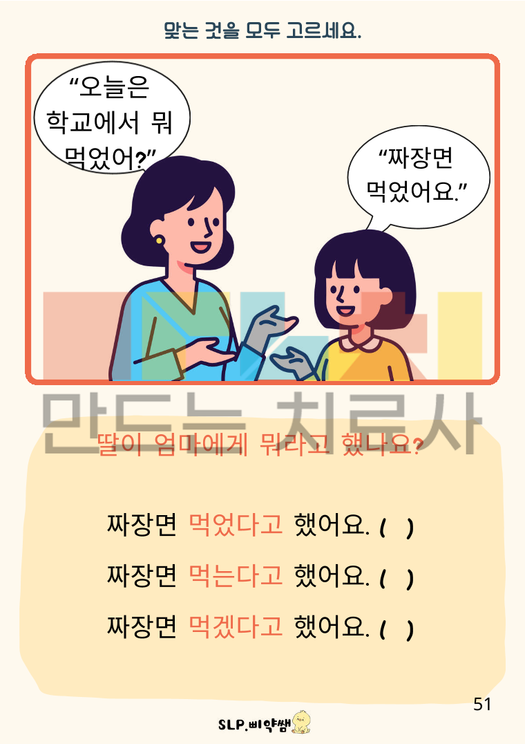 다른 사람이 한 이야기를 전달하는 방식에는 직접 인용과 간접 인용이 있지요. 직접 인용은[ "엄마가 밥 먹어."라고 했어.]와 같이 전달하면 되니 아이들이 비교적 잘 이야기 합니다. 반면, 간접 인용은 평서문, 의문문, 명령문, 청유문에 따락 '-다고, -냐고,-라고, -자고'와 같은 표현을 써서 활용해야 하므로 전달하기 어려워하는 아동들이 있습니다. SLP가 말 한 직후 "선생님이 뭐라고 했지?"라고 물어도 잘 대답하지 못하는 경우가 많습니다. (여기서는 주의집중 문제로 대답 못하는 아동들 대신 인용절 사용이 어려운 아동들을 예로 든 것입니다. 단, 주의 집중에 문제가 있는 아동들도 듣기 연습을 하면서 주의집중 및 인용절 사용을 훈련해도 좋습니다.) 글을 읽지 못하는 아동들은 SLP가 그림을 보여주며, 역할극처럼 대사를 읽어준 후 듣고 대답하는 형식으로 하면 더 재미있는 연습이 됩니다 ^^