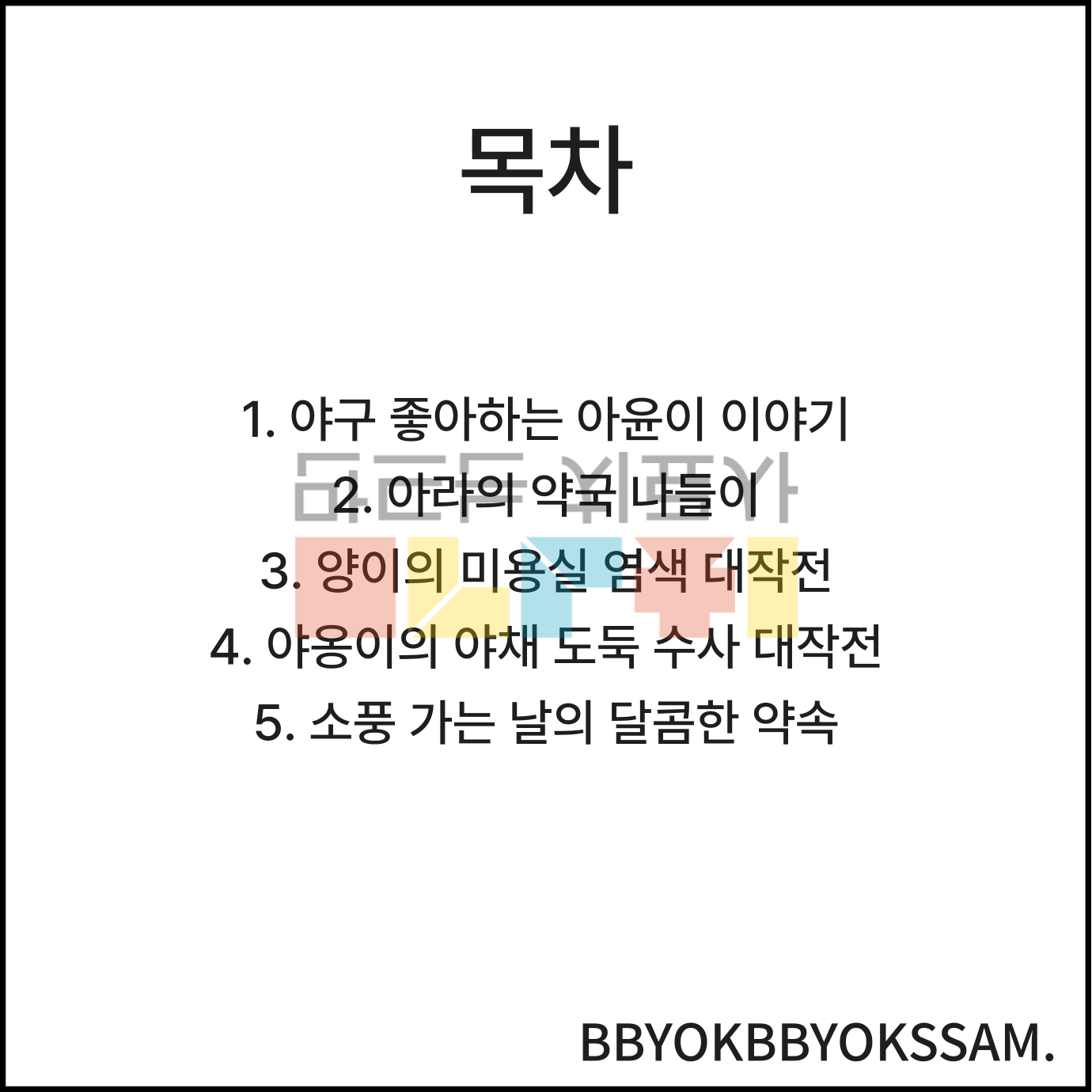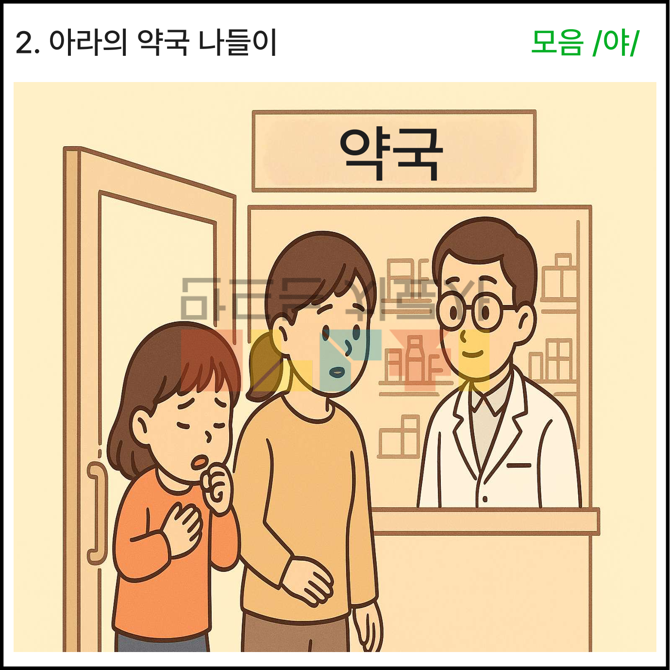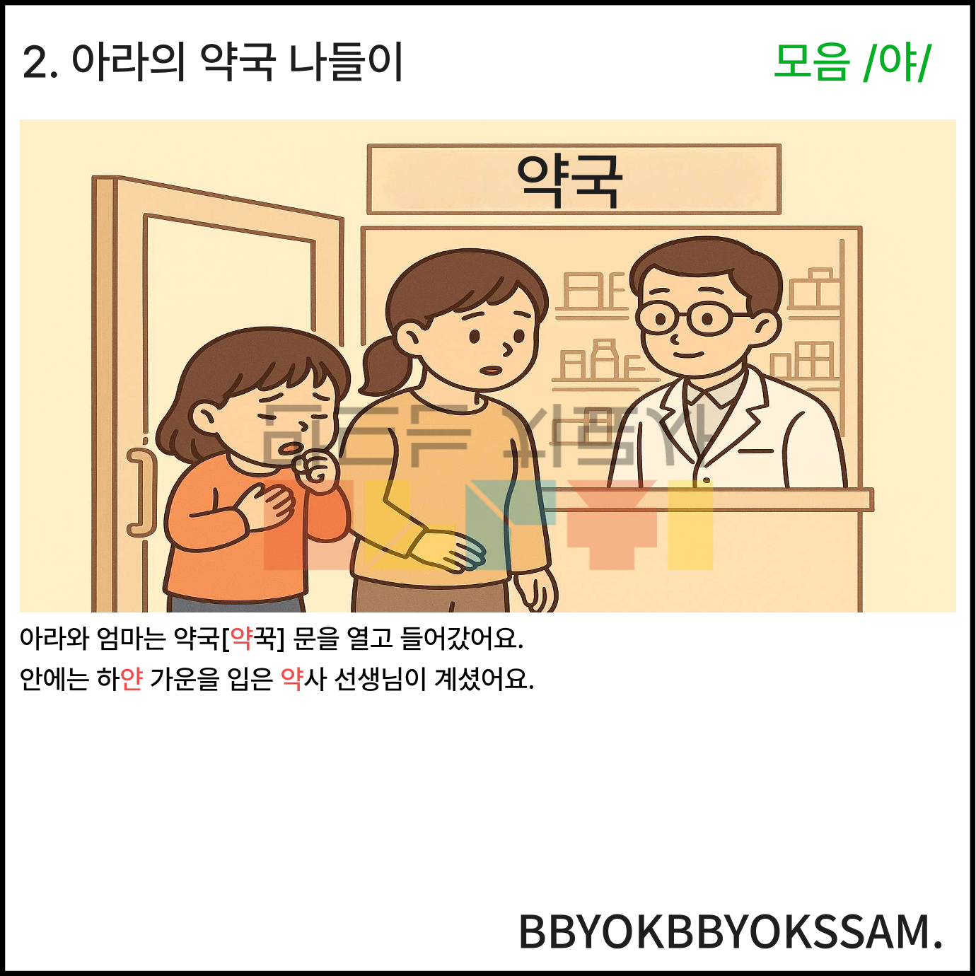 모음 /야/와 관련한 상황이야기 5가지로 구성되어있습니다. 각 장면은 5컷 장면으로 구성되어있습니다. 빨간색으로 표시된 글씨가 목표 음소입니다