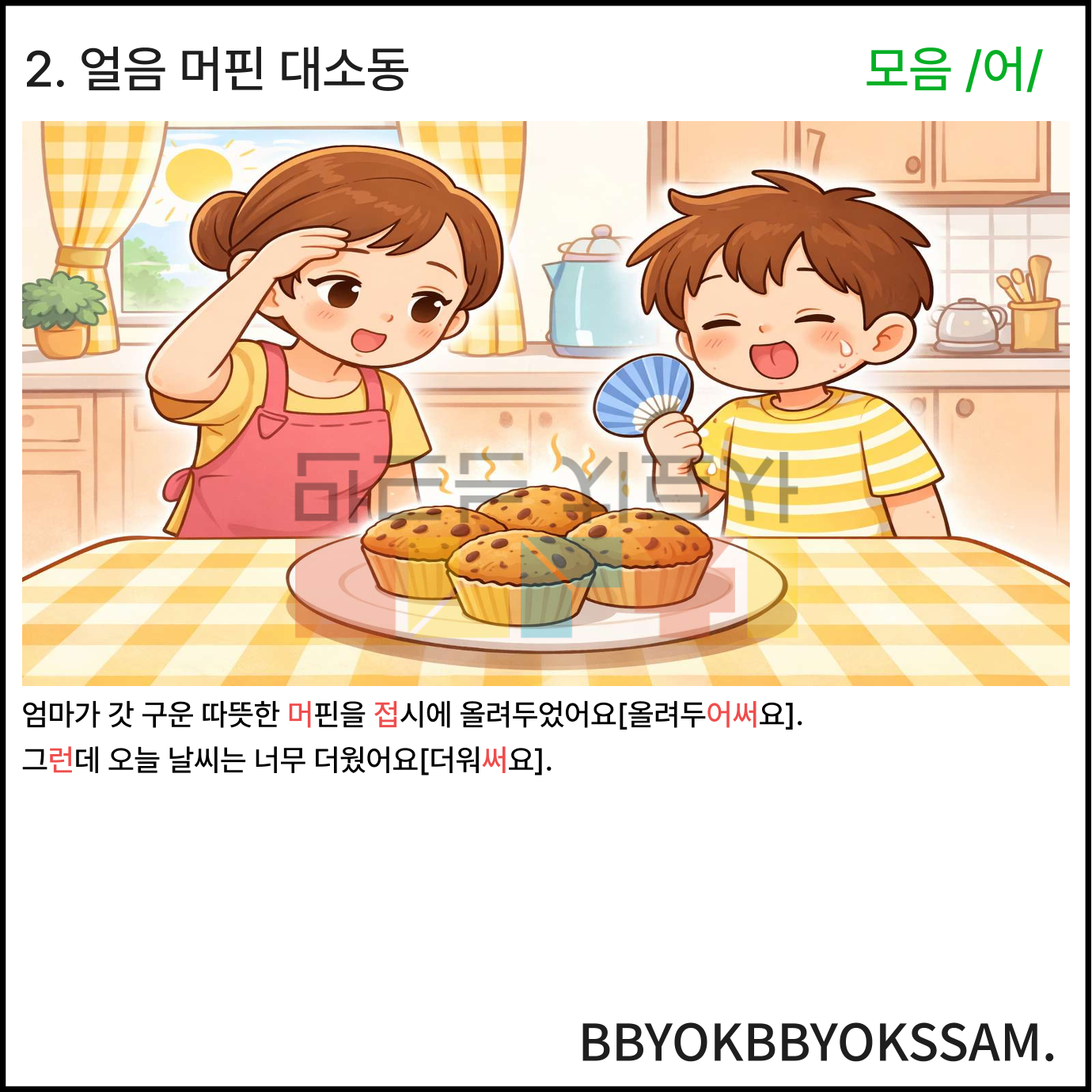 모음 /어/와 관련한 상황이야기 5가지로 구성되어있습니다. 각 장면은 5컷 장면으로 구성되어있습니다. 빨간색으로 표시된 글씨가 목표 음소입니다.