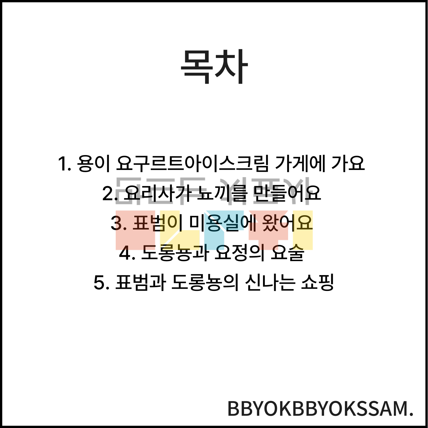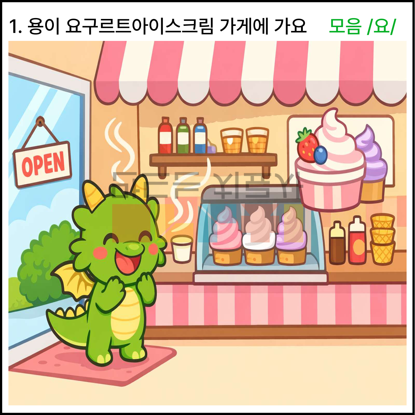 모음 /요/와 관련한 상황이야기 5가지로 구성되어있습니다. 각 장면은 5-6컷 장면으로 구성되어있습니다. 빨간색으로 표시된 글씨가 목표 음소입니다.