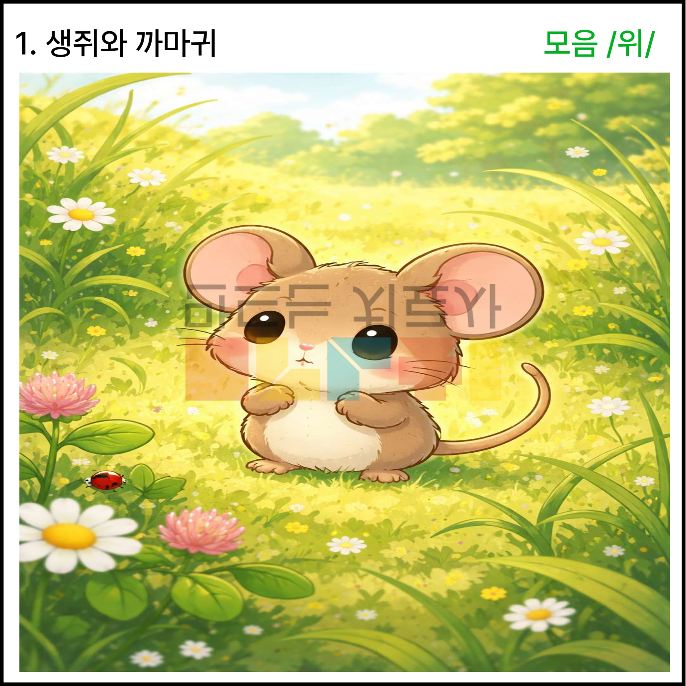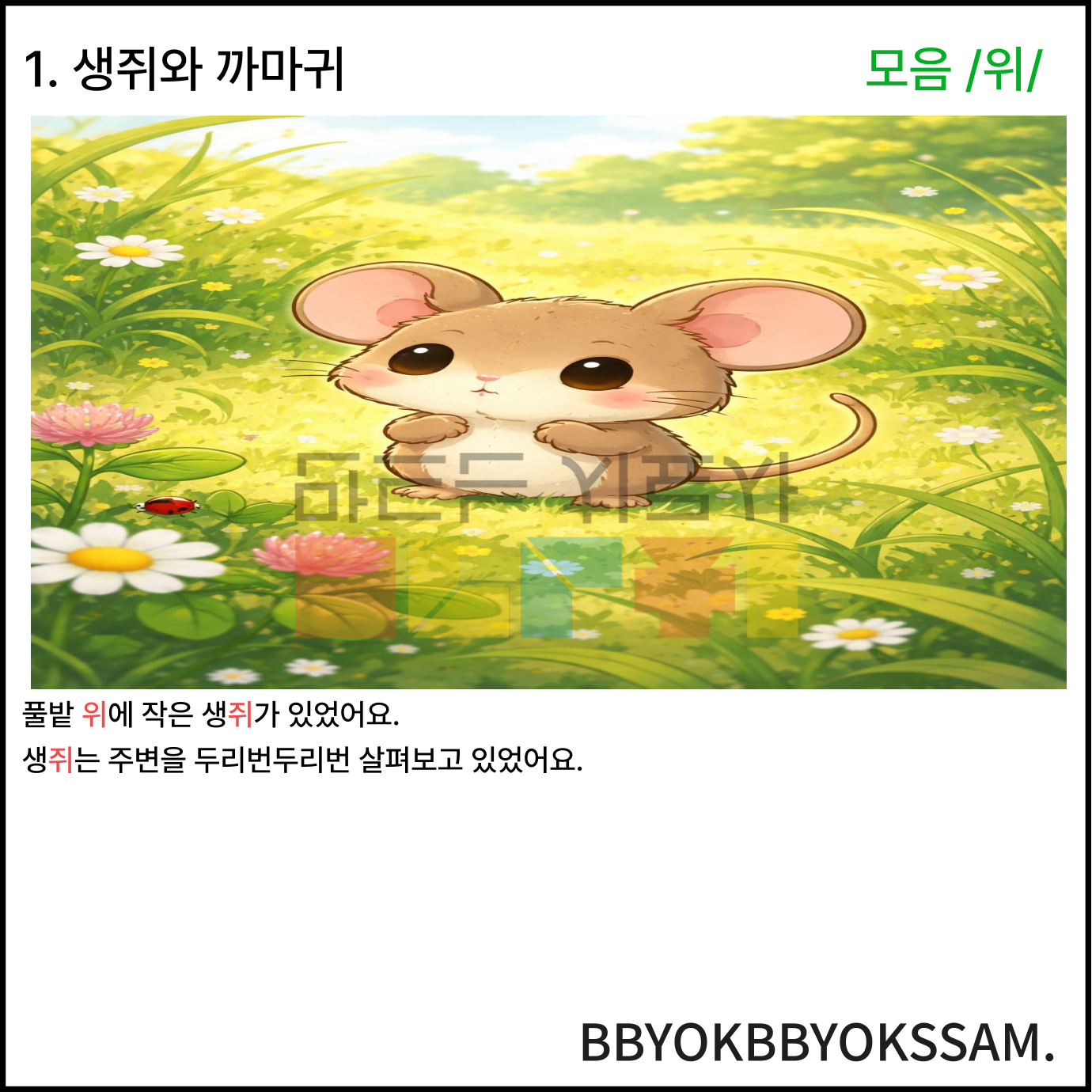 모음 /위/와 관련한 상황이야기 5가지로 구성되어있습니다. 각 장면은 5-6컷 장면으로 구성되어있습니다. 빨간색으로 표시된 글씨가 목표 음소입니다.