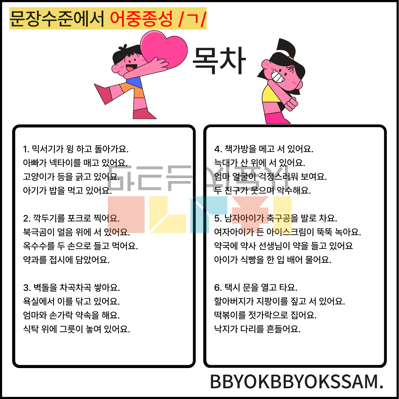 문장 수준에서 어중종성과 어말종성 /ㄱ/으로 1페이지에 3-4장면의 문장을 연습하는 것으로 구성하였습니다. 어중종성과 어말종성은 각 10페이지로 구성되어 있습니다.