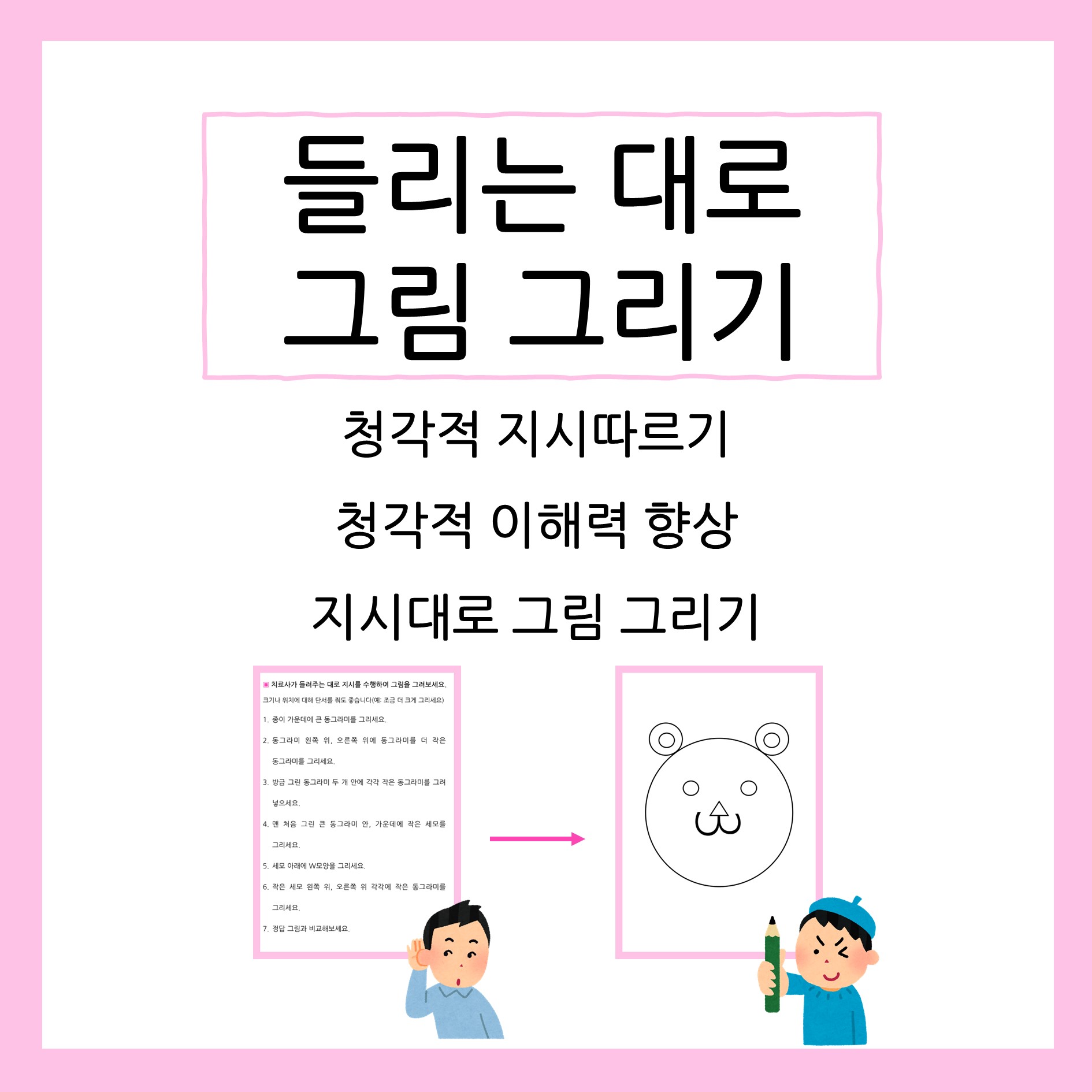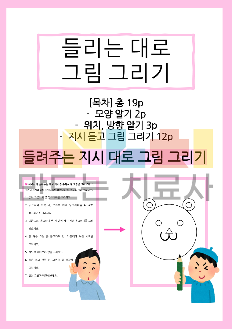 들려주는 지시대로 그림 그리기 방향 및 위치, 모양이 포함된 지시 수행 활동지 입니다. [목차] 총 19p -모양 알기 2p -위치, 방향 알기 3p -지시 듣고 그림 그리기 12p