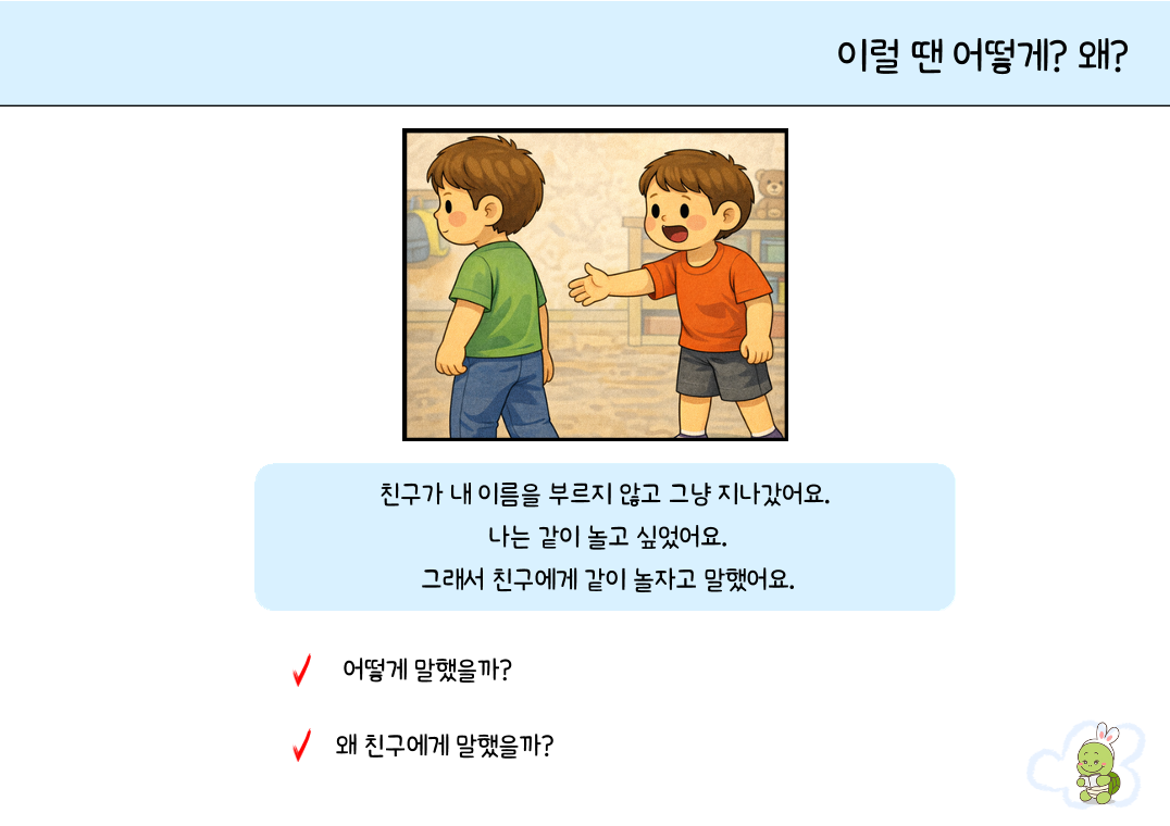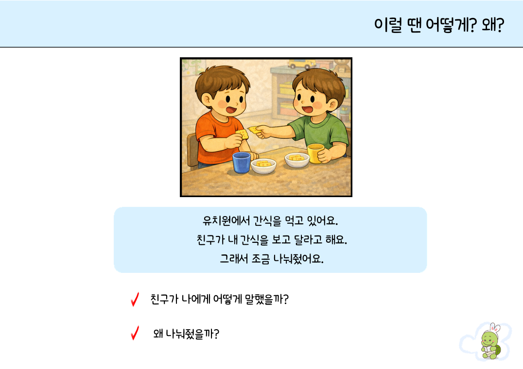 아이들이 일상생활(유치원, 놀이터, 가정 등)에서 흔히 겪는 갈등 상황을 상황그림으로 담아낸 상황 추론 및 사회성 기술 훈련 자료입니다. 단순히 상황을 설명하는 것에 그치지 않고, 타인의 감정을 이해하고 적절한 해결책을 말로 표현하는 힘을 길러줍니다. 1. 대상 -만 4세 ~ 초등 저학년: 일상적인 사회적 규칙을 배우고 실천해야 하는 시기의 아동 -상황에 맞는 적절한 화용 언어(사회적 의사소통) 사용이 어려운 아동 -사건의 **원인과 결과를 파악(인과관계 추론)**하는 데 어려움을 겪는 아동 2. 자료 구성 및 특징 "어떻게 했을까?": 상황에 맞는 적절한 말하기와 대처 행동 유도 "왜 그랬을까?": 상황의 원인 파악 및 사회적 규칙의 필요성(도덕성/공감) 인지 3. 학습 목표 상황 추론 및 인과관계 이해: "왜 이런 일이 일어났을까?"에 대해 논리적으로 설명할 수 있습니다. 화용적 언어 기술 습득: 갈등 상황에서 상대방의 기분을 상하지 않게 하면서 자신의 의사를 전달하는 법을 배웁니다. 문제 해결 전략 수립: 예상치 못한 문제가 생겼을 때 스스로 대안을 찾는 연습을 합니다. 4. 활용 팁! 역할극: 그림 속 대화를 아이와 치료사가 직접 주고받으며 연습해 보세요. 확장 활동: "만약 ~라면 어떻게 될까?"라는 질문을 통해 그림 너머의 상황을 상상하며 사고력을 넓힐 수 있습니다.