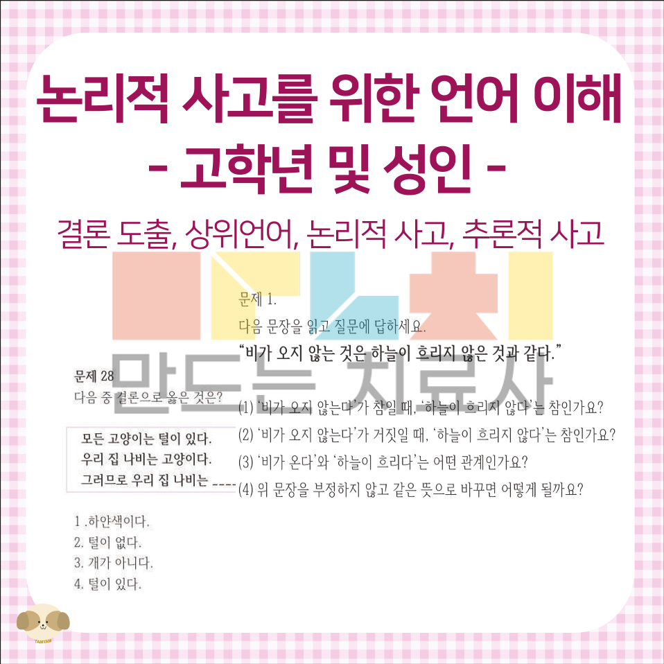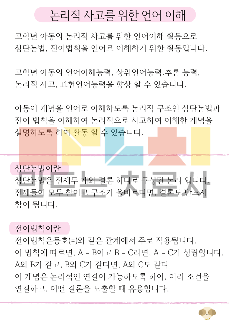 논리적 사고 훈련으로 아동의 개념이해를 도와줄 수 있습니다. 이 활동으로 언어의 조건과 개념을 명확하게 이해하여 논리적 언어능력을 증진 시키고, 분류와 범주화 능력을 연습하여 개념을 이해하기 위한 언어능력을 향상 시킬 수 있습니다.