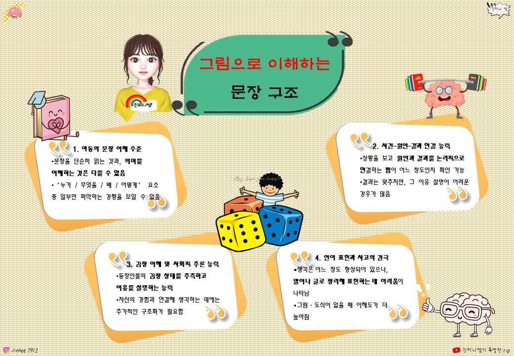 1. 아동의 문장 이해 수준 -문장을 단순히 읽는 것과, 의미를 이해하는 것은 다를 수 있음 -‘누가 / 무엇을 / 왜 / 어떻게’ 요소 중 일부만 파악하는 경향을 보일 수 있음 2. 사건–원인–결과 연결 능력 -상황을 보고 원인과 결과를 논리적으로 연결하는 힘이 어느 정도인지 확인 가능 -결과는 맞추지만, 그 이유 설명이 어려운 경우가 많음 3. 감정 이해 및 사회적 추론 능력 -등장인물의 감정 상태를 추측하고 이유를 설명하는 능력 -자신의 경험과 연결해 생각하는 데에는 추가적인 구조화가 필요함 4. 언어 표현과 사고의 간극 -생각은 어느 정도 형성되어 있으나, 말이나 글로 정리해 표현하는 데 어려움이 나타남 -그림·도식이 있을 때 이해도가 더 높아짐 🧠 한 문장으로 정리하면 이 책은 아동이 ‘읽고 아는지’가 아니라, ‘이해하고 생각하는지’를 확인할 수 있는 인지·독해 자료입니다.