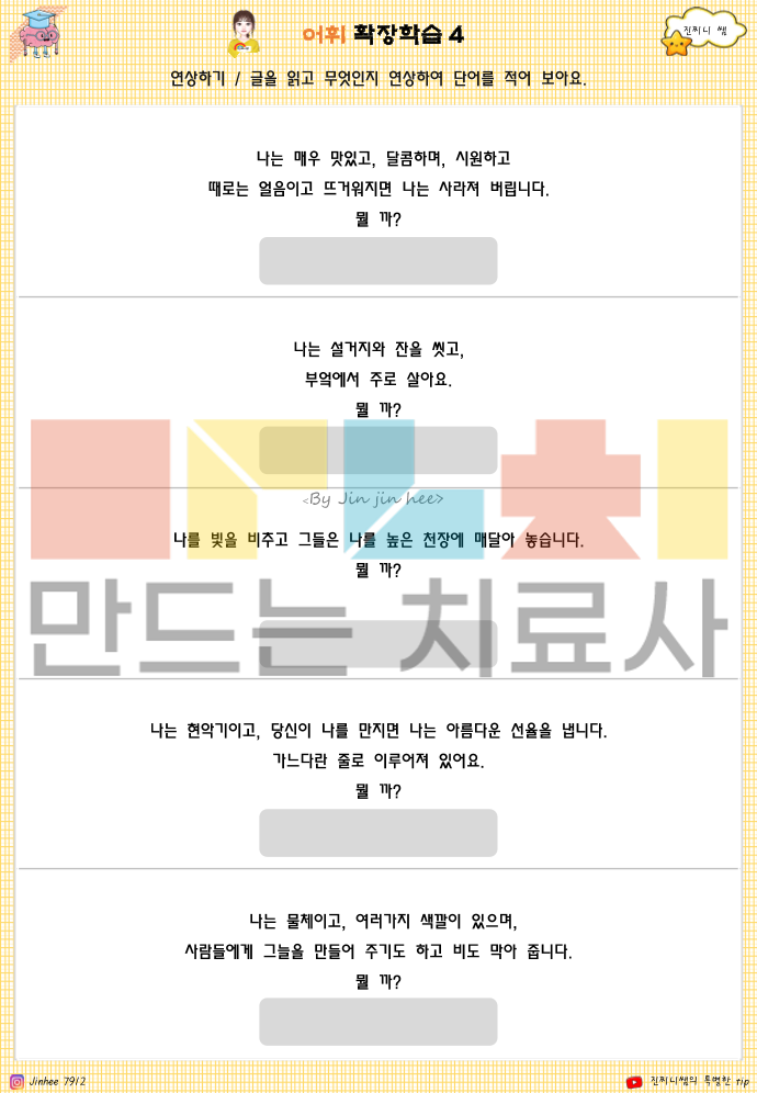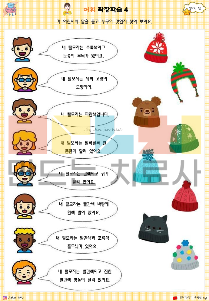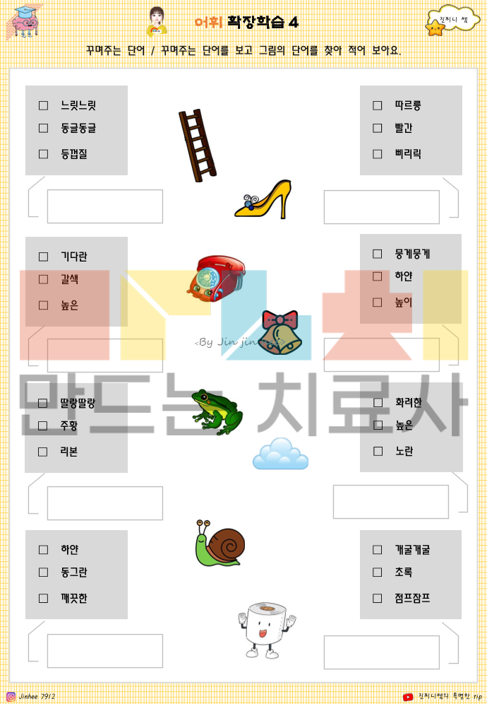 📘 이 책으로 알 수 있는 것은 -어휘 이해 수준: 사물·상황의 의미를 정확히 알고 있는지 -문장 이해력: 질문을 듣고 문장의 핵심을 파악하는지 -추론 능력: 글이나 그림의 단서를 바탕으로 이유·결과를 생각할 수 있는지 -범주화 능력: 사물·개념을 공통점으로 묶어 이해하는지 -감정 이해: 상황에 따른 인물의 감정과 마음 변화를 파악하는지 -사고의 흐름: ‘상황 → 생각 → 감정 → 행동’을 연결해 이해하는지 -생활 적용력: 배운 어휘와 개념을 일상 장면에 연결할 수 있는지 👉 한 줄로 정리하면 이 책은 아이가 말을 ‘아는지’가 아니라, 이해하고 생각해서 말할 수 있는지를 보여주는 인지·언어 기초 자료입니다.^^