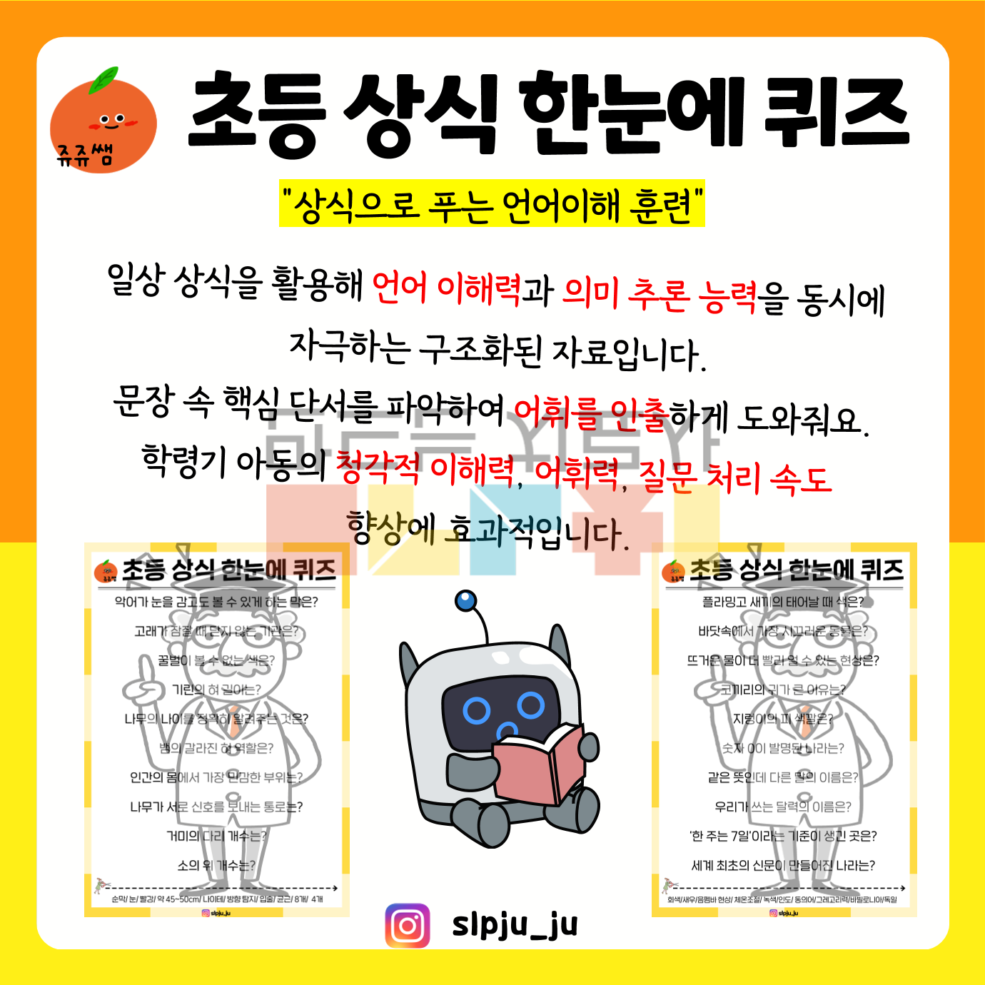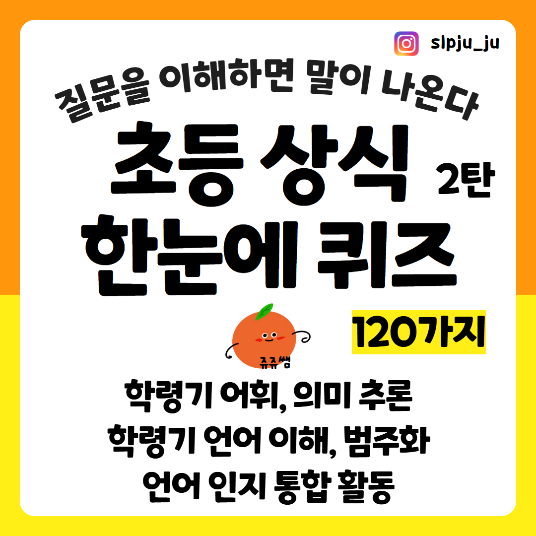 안녕하세요 쥬쥬쌤입니다. 일상 상식을 활용해 언어 이해력과 의미 추론 능력을 동시에 자극하는 구조화된 자료입니다. 문장 속 핵심 단서를 파악하여 어휘를 인출하게 도와줘요. 학령기 아동의 청각적 이해력, 어휘력, 질문 처리 속도 향상에 효과적입니다.