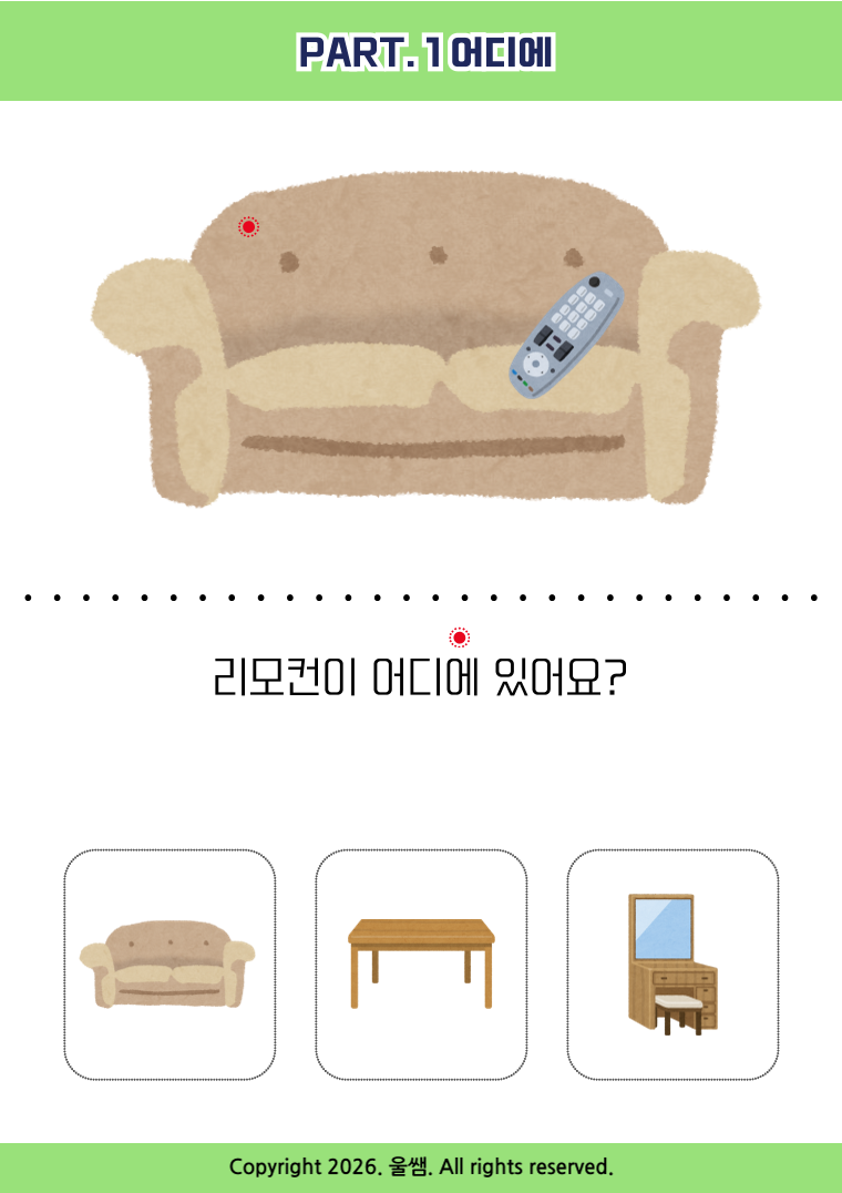 🎯 활동대상 - 조사사용이 미숙하거나 문장확장이 필요한 아이 - 시각적 단서를 통해 상황을 이해하고자 하는 아이 - 직관적인 그림과 선택지를 통해 성공경험을 쌓고 싶은 아이 ⭐️ Part. 1 '어디에' 자료는? 사물이 놓여 있는 고정된 위치를 파악하고 장소명사를 익히는 단계입니다 👀 시각적 단서효과 정답 위치에 빨간 점을 배치하여, 아이의 시선이 머물러야 할 곳을 직관적으로 인지할 수 있도록 하며 "어디에 있지?"라는 질문에 명확한 지점을 찾도록 유도합니다