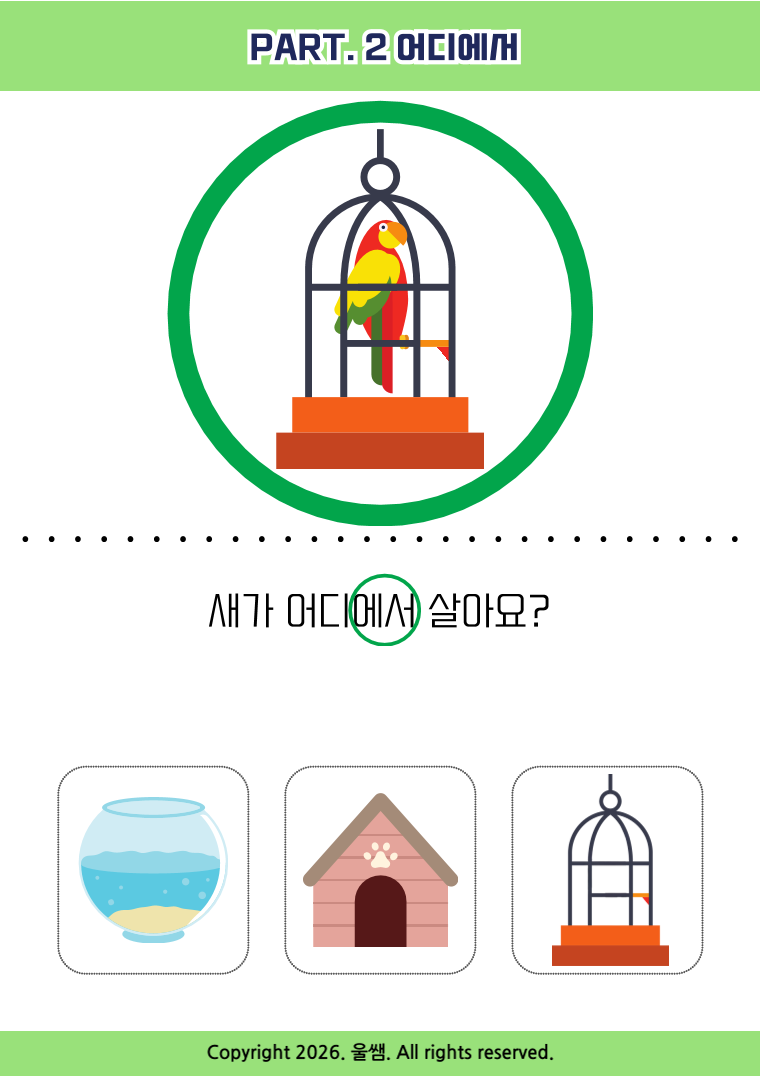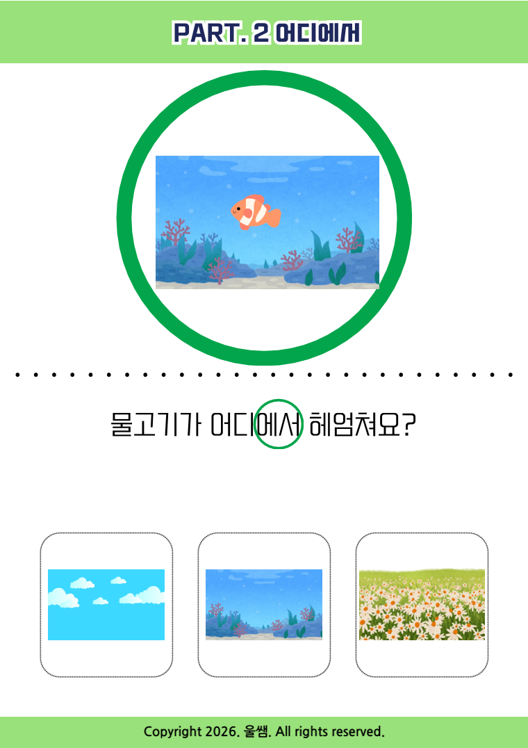 🎯 활동대상 - 조사사용이 미숙하거나 문장확장이 필요한 아이 - 시각적 단서를 통해 상황을 이해하고자 하는 아이 - 직관적인 그림과 선택지를 통해 성공경험을 쌓고 싶은 아이 ⭐️ Part. 2 '어디에서' 자료는? 특정 행동이나 일이 일어나는 '공간 범위'를 이해하는 단계입니다 👀 시각적 단서효과 활동이 일어나는 범위를 초록색 원으로 강조하여 단순히 장소를 넘어 '어디에서 ~을 하는지' 상황과 장소의 연관성을 학습하게 합니다