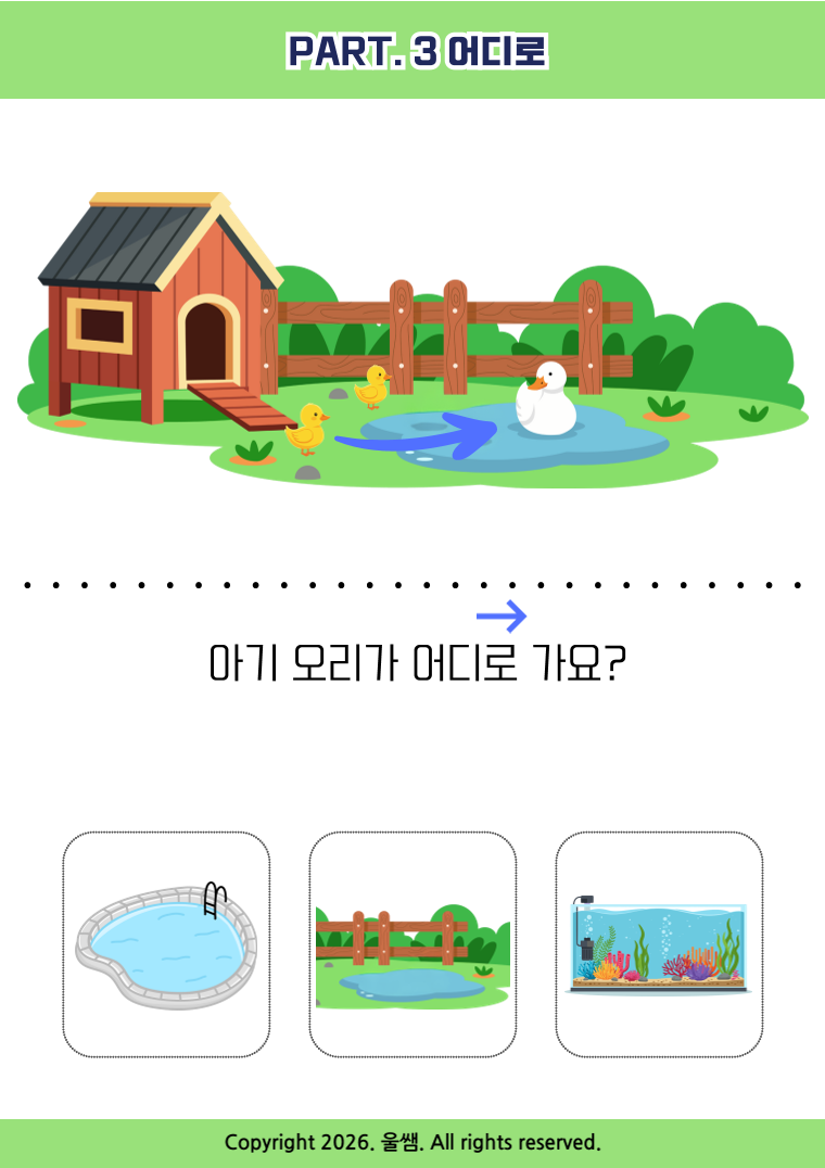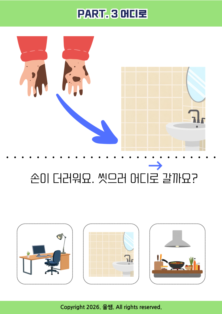 🎯 활동대상 - 조사사용이 미숙하거나 문장확장이 필요한 아이 - 시각적 단서를 통해 상황을 이해하고자 하는 아이 - 직관적인 그림과 선택지를 통해 성공경험을 쌓고 싶은 아이 ⭐️ Part. 3 '어디로' 자료는? 상태나 필요(원인)에 따라 목적지를 향해 움직이는 '방향성'을 학습하는 단계입니다 👀 시각적 단서효과 이동의 흐름을 나타내는 파란색 화살표를 사용하여 출발지와 목적지를 시각적으로 연결하여 '~로' 조사의 기능을 자연스럽게 습득하도록 돕습니다