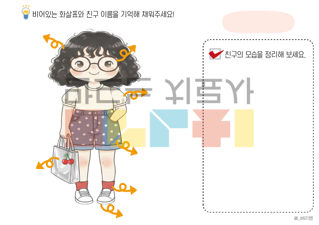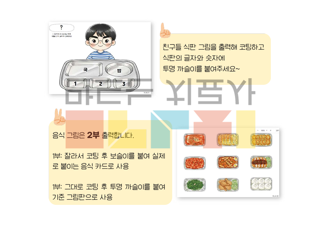 🧠 인지·언어 통합 활동 자료 안내 본 자료는 주의력 및 작업기억 기능이 미숙한 학령기 아동을 대상으로, 시각·청각 정보를 통합적으로 처리하고 기억하는 능력을 기르기 위해 제작된 인지·언어 통합 활동 자료입니다. 아동은 친구의 얼굴, 생김새, 옷차림과 같은 시각적 단서를 기억하고 이를 이름과 연결하여 회상하는 과정을 통해 인물 변별 능력과 시각·청각 주의력을 훈련합니다. 또한 급식 식판 메뉴 기억하기 활동을 통해 메뉴 구성과 음식의 위치를 단계적으로 기억하고 재구성하며 작업기억, 시각 기억, 순서 기억 능력을 강화합니다. 이 과정에서 인물 및 음식 관련 어휘를 활용해 설명하며 설명하기 능력, 어휘 확장, 의미 조직화 능력을 함께 증진할 수 있습니다. 🔹 기대 효과 청각·시각 주의력 증진 작업기억 및 시각 기억력 향상 인물 특징과 이름 연결 기억 능력 강화 메뉴·위치 기억을 통한 순서 기억 능력 향상 설명하기 능력 및 관련 어휘 확장 🔹 추천 대상 주의력이 쉽게 분산되는 학령기 아동 작업기억·시각·청각 기억이 미숙한 아동 인물 구분 및 이름 기억에 어려움이 있는 아동 설명하기 및 어휘 표현이 제한적인 아동
