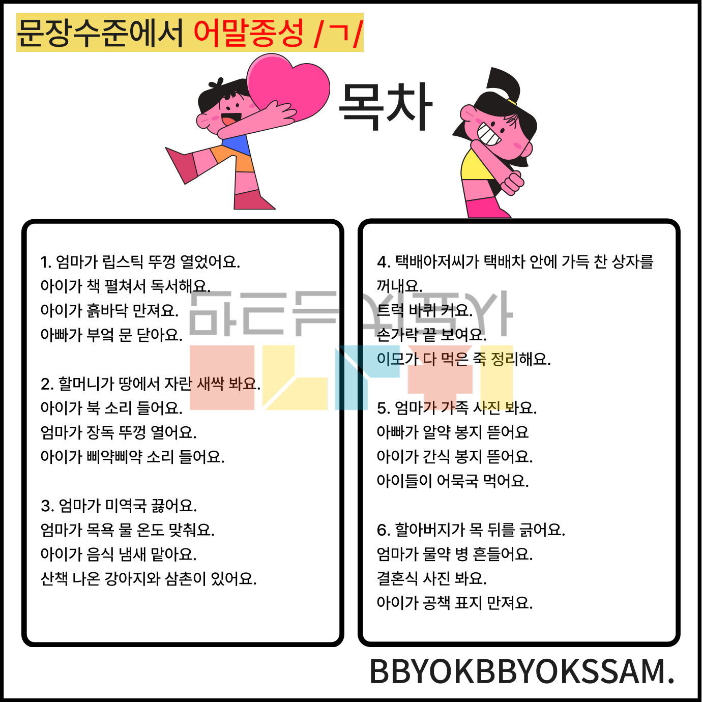 문장 수준에서 어중종성과 어말종성 /ㄱ/으로 1페이지에 3-4장면의 문장을 연습하는 것으로 구성하였습니다. 어중종성과 어말종성은 각 10페이지로 구성되어 있습니다.