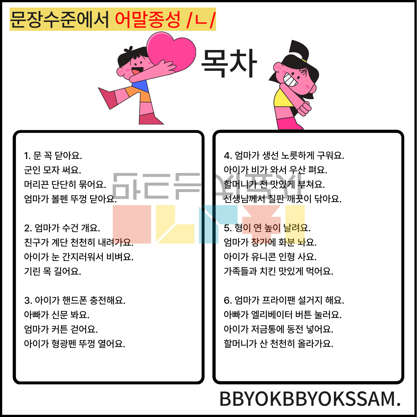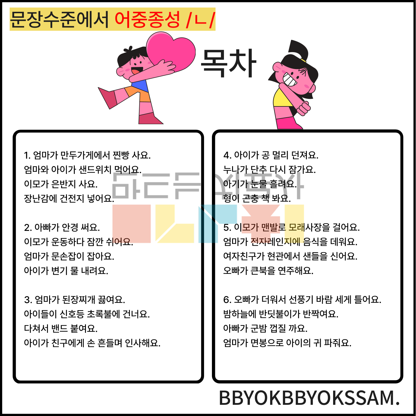 문장 수준에서 어중종성과 어말종성 /ㄴ/으로 1페이지에 2-4장면의 문장을 연습하는 것으로 구성하였습니다. 어중종성과 어말종성은 각 10페이지로 구성되어 있습니다.