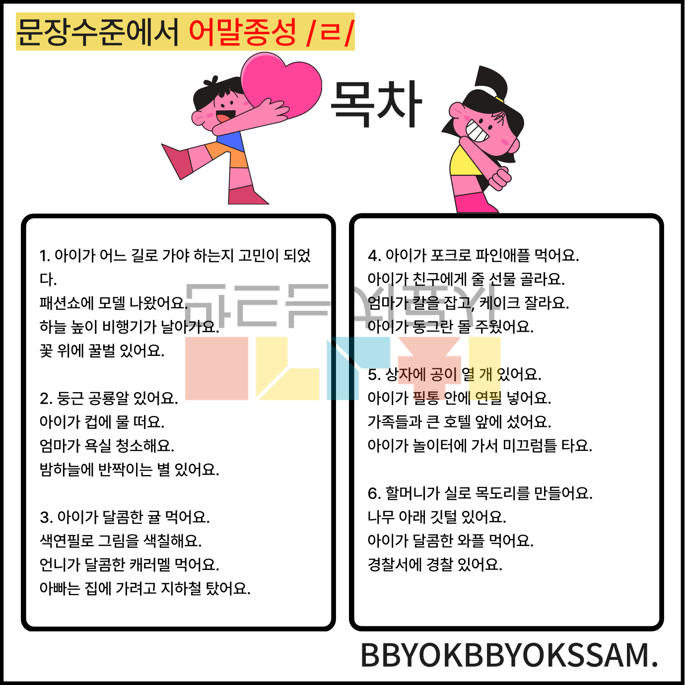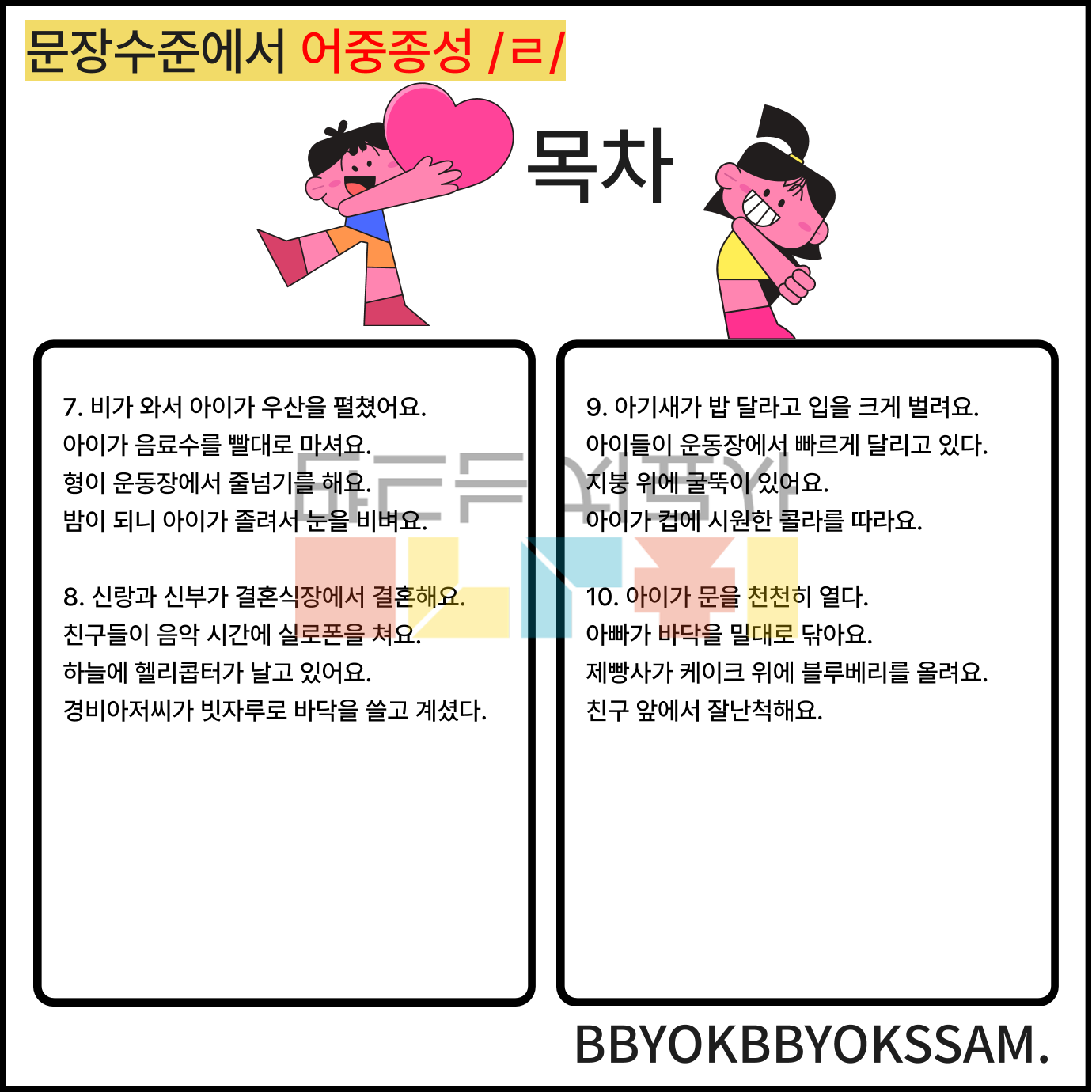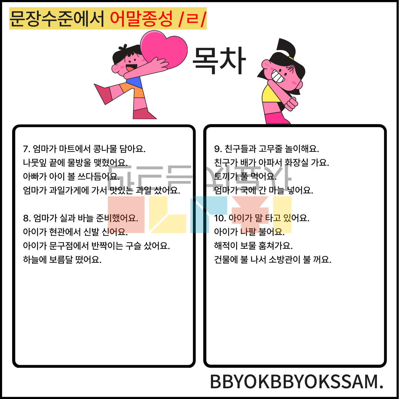 문장 수준에서 어중종성과 어말종성 /ㄹ/으로 1페이지에 4장면의 문장을 연습하는 것으로 구성하였습니다. 어중종성과 어말종성은 각 10페이지로 구성되어 있습니다.