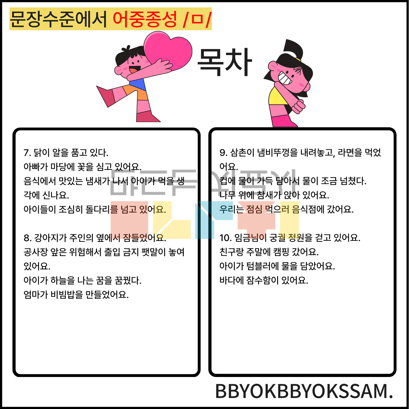 문장 수준에서 어중종성과 어말종성 /ㄹ/으로 1페이지에 2-4장면의 문장을 연습하는 것으로 구성하였습니다. 어중종성과 어말종성은 각 10페이지로 구성되어 있습니다.