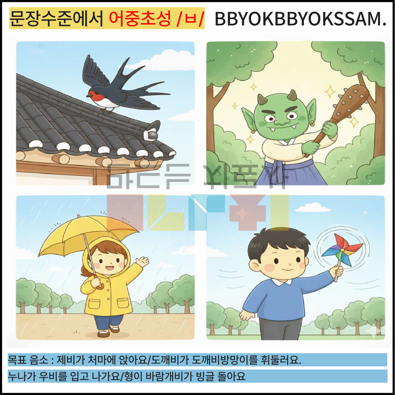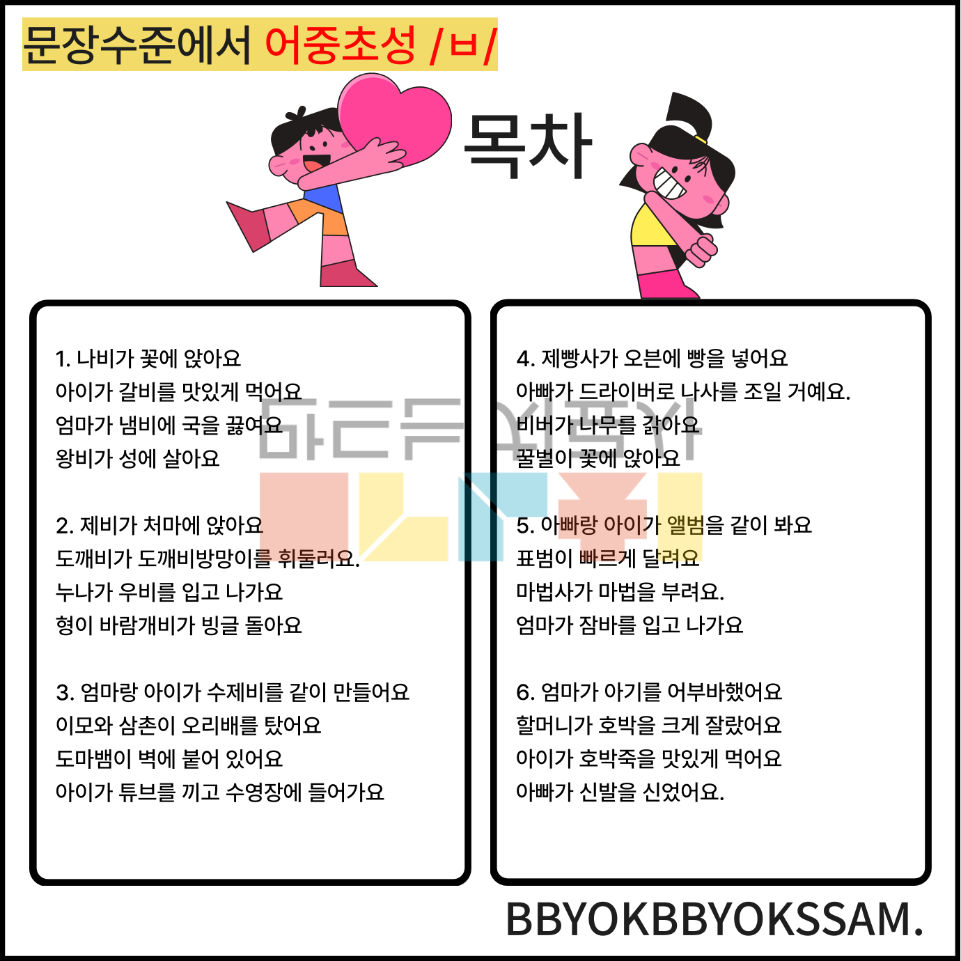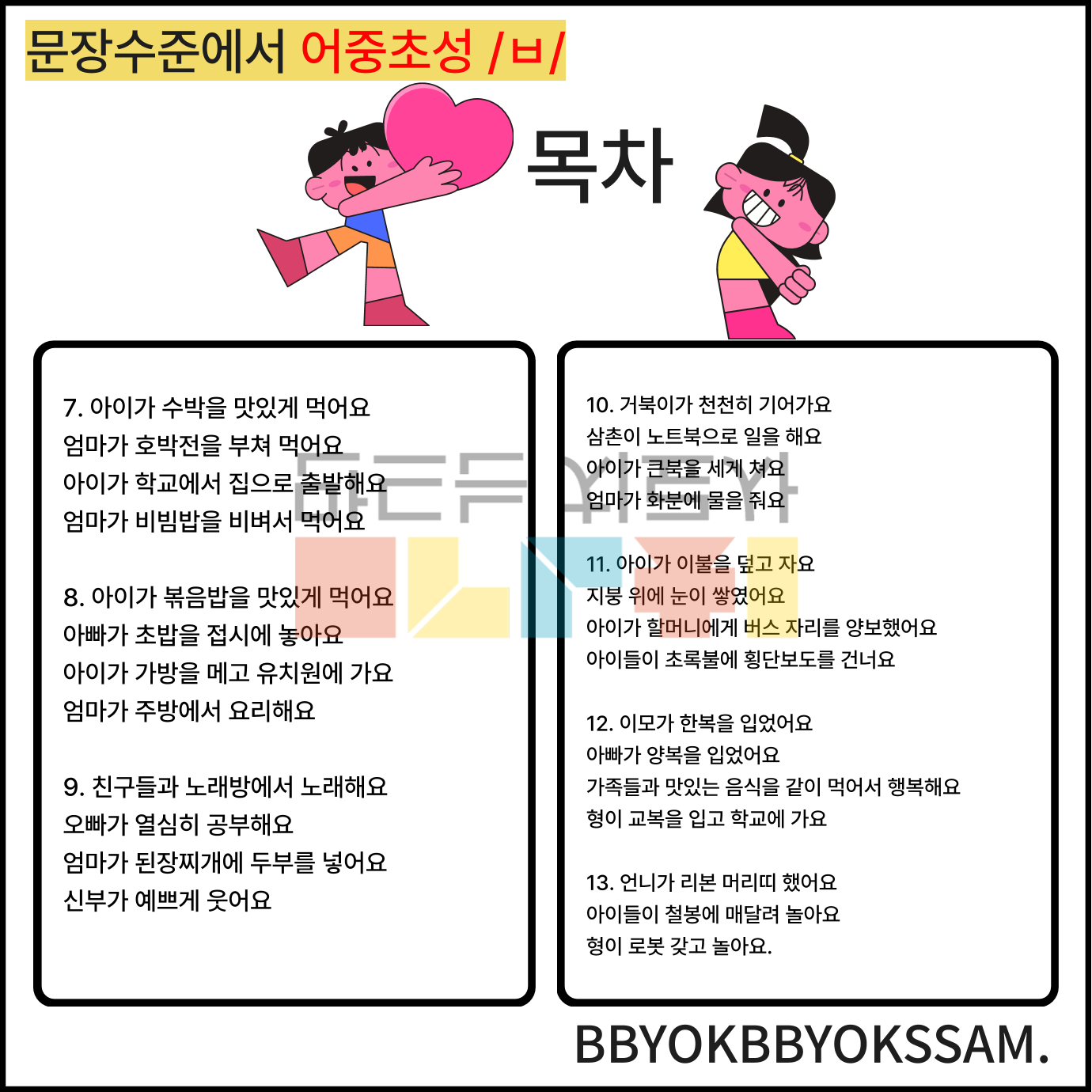 문장 수준에서 어중초성 /ㅂ/으로 1페이지에 3-4장면의 문장을 연습하는 것으로 구성하였습니다. 어중초성 13페이지로 구성되어 있습니다.