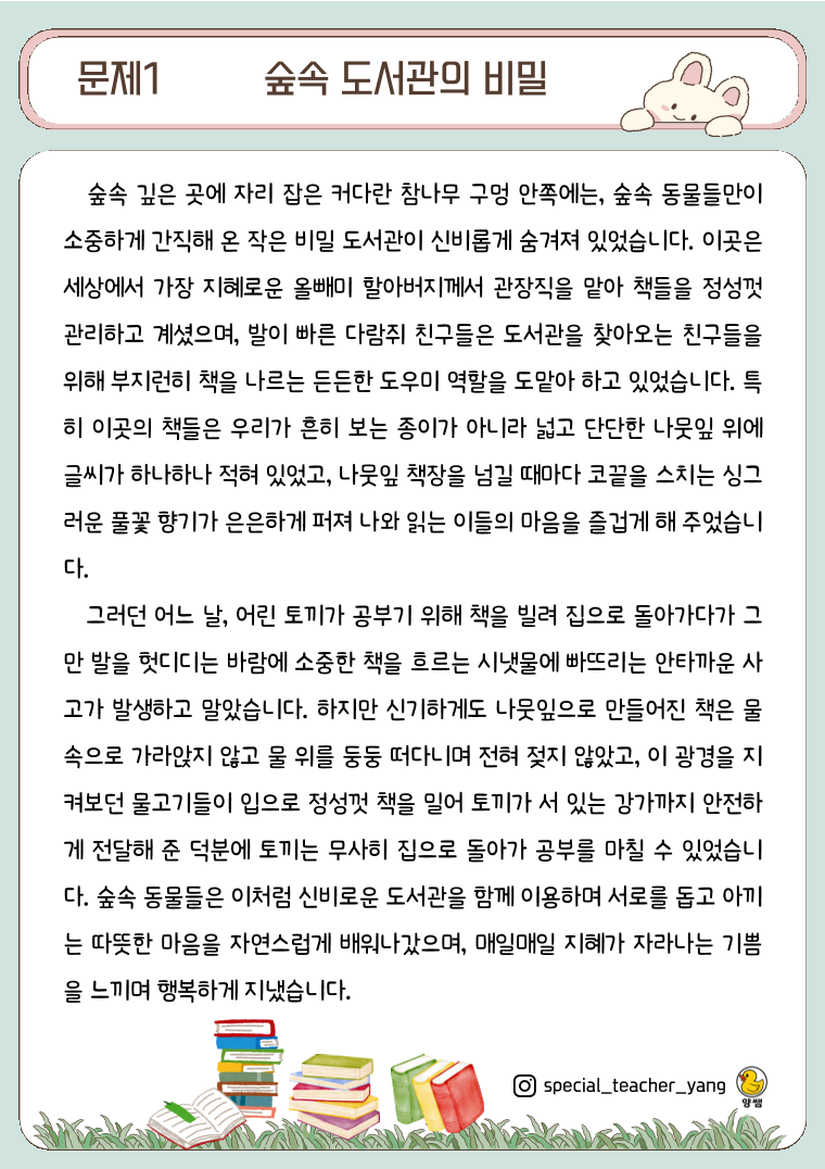 상품 형태 : PDF 파일 (구매 후 다운로드) 제작 : 양쌤 총 페이지 수 : 71 ★ 초등 저학년을 위한 이야기 글 독해 워크북입니다. ★ 초등 1학년 2학기~2학년 수준의 글로 구성되어 있습니다. ★ 지문 35개와 각 지문에 대한 9개의 문제로 이루어져 있습니다. ★ 문제 9개의 문제 유형은 단답형 혹은 서술형 문제입니다. ★ 다채로운 지문과 내용 이해, 어휘, 추론 등 다양한 분야의 문제를 만나보세요!