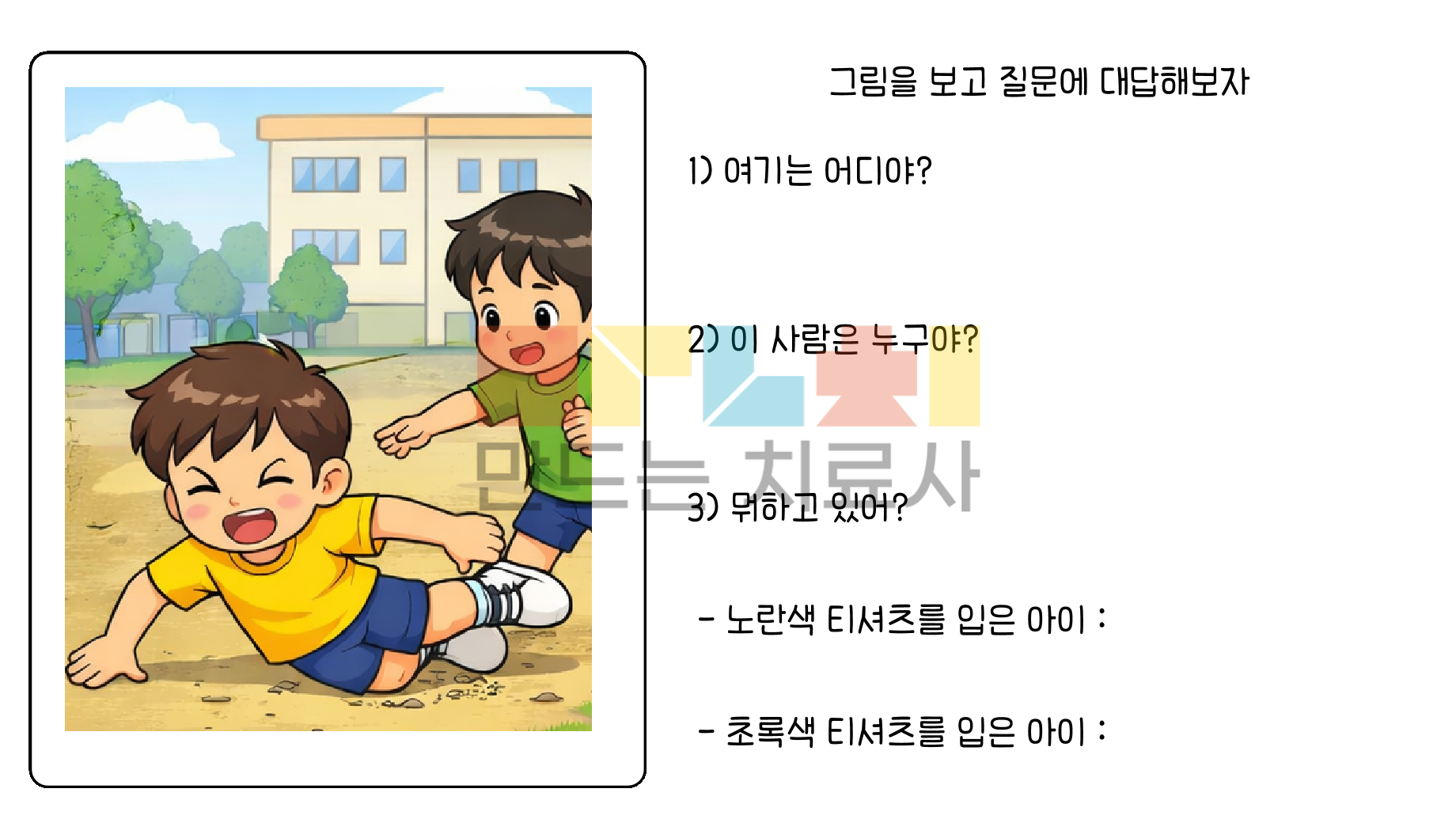 1) 각각의 그림을 보고 질문에 대답해요 2) 이어져 있는 세 그림을 보고 순서대로 말해요 쓰기 가능한 친구들은 쓰기도 병행해서 하면 좋을 것 같습니다. 빈칸의 경우 바로 위 질문의 정답을 이용한 질문입니다. 예) 친구 기분이 어때? - 정답 : 행복해요 - 왜 ( 행복해 ) ? - 정답 : ____