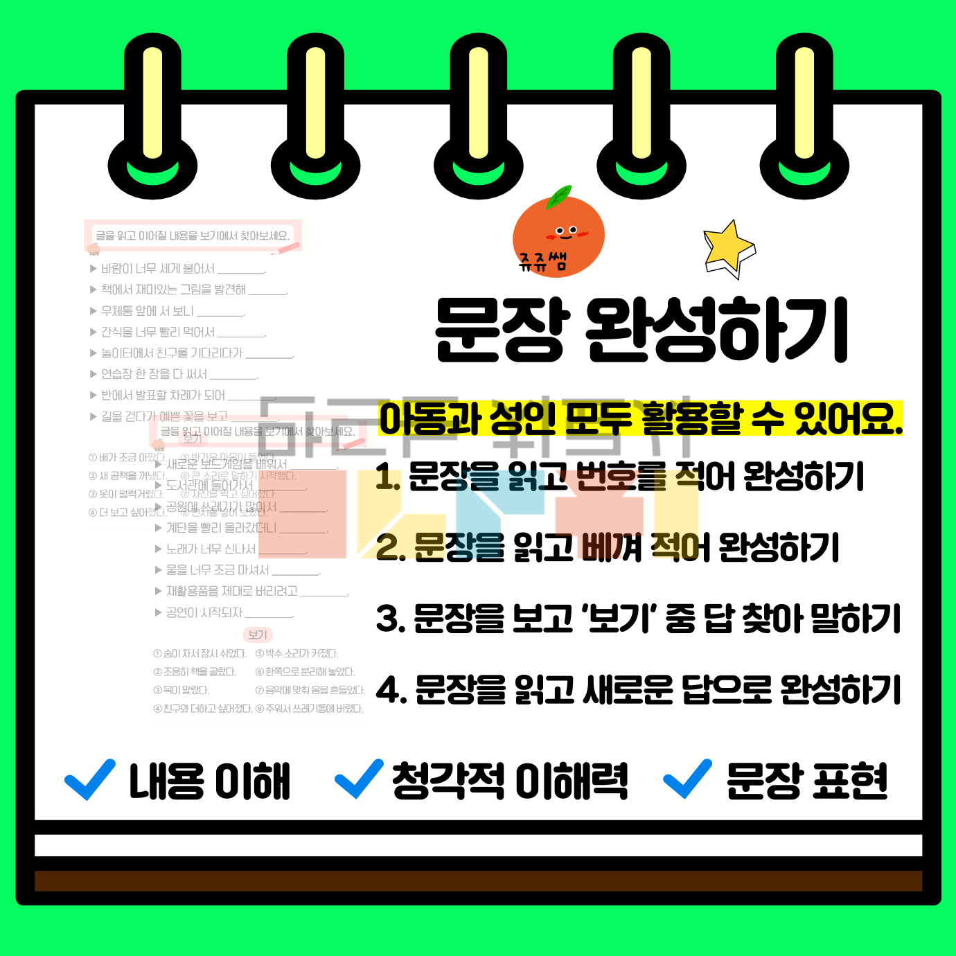 안녕하세요 쥬쥬쌤입니다. 아동과 성인 모두 활용할 수 있는 문장 완성하기! [치료 목표] - 내용 이해, 청각적 이해력, 문장 표현 1. 문장을 읽고 번호를 적어 완성하기 2. 문장을 읽고 베껴 적어 완성하기 3. 문장을 보고 '보기' 중 답 찾아 말하기 4. 문장을 읽고 새로운 답으로 완성하기 5. 문장을 듣고 '보기'를 보고 번호 고르기 6. 문장을 듣고 문장을 말하여 완성하기 7. 문장을 듣고 새로운 답으로 완성하기 8. 문장을 완성하여 받아쓰기로 활용하기