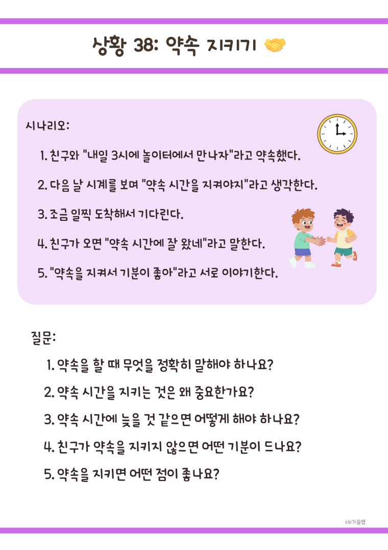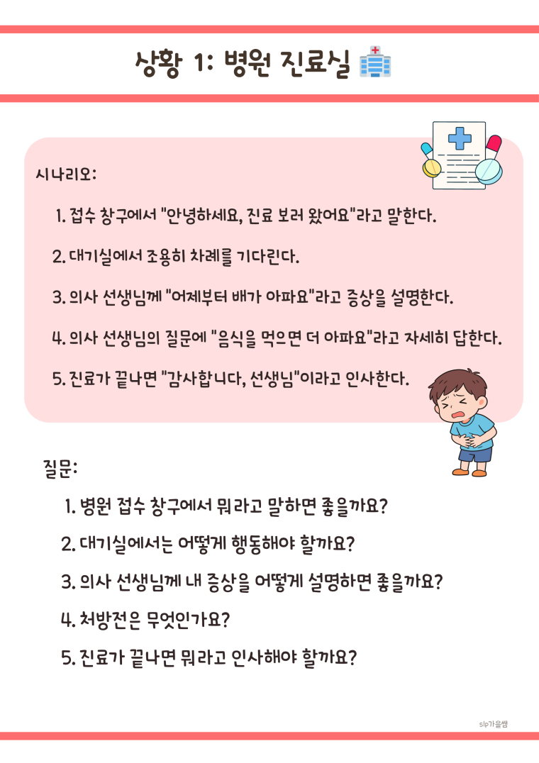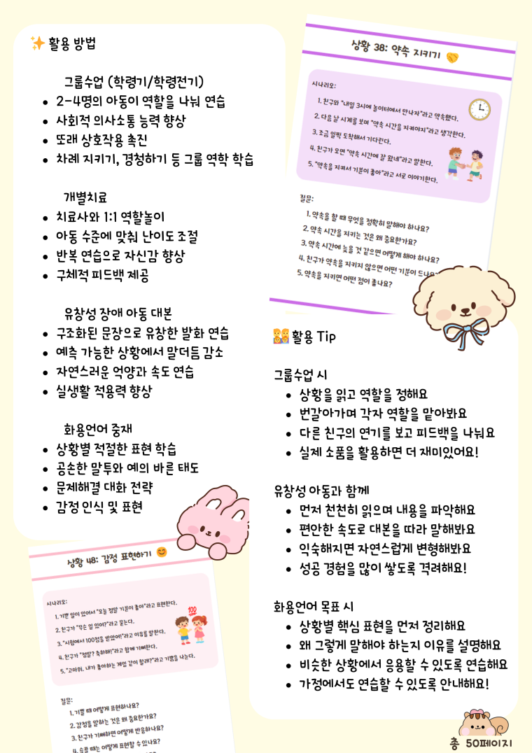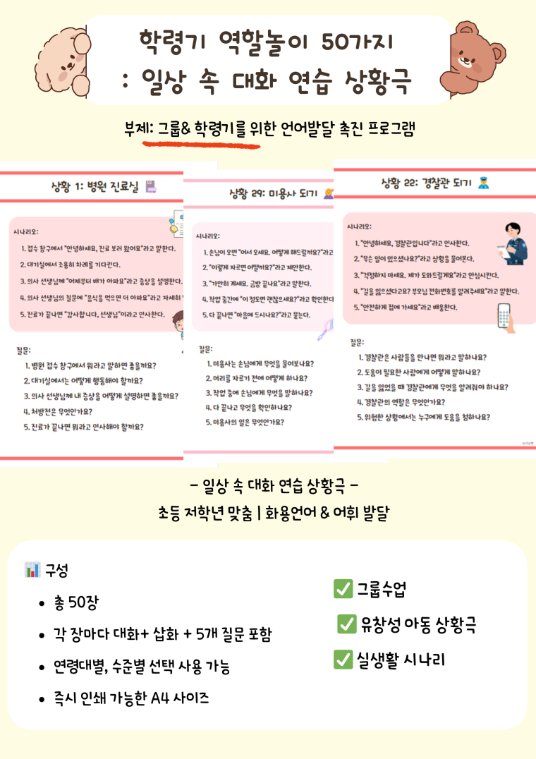 초등 저학년 맞춤 | 화용언어 & 어휘 발달 ✅ 50개 실생활 상황 시나리오 ✅ 250개 질문으로 체계적 학습 ✅ 그룹수업, 개별치료 모두 활용 가능 ✅ 유창성 장애 아동 대본으로도 완벽! 📌 일상생활부터 문제해결까지 병원·마트·식당·도서관·갈등해결·감정표현 등 실제로 쓰는 표현을 자연스럽게! #언어치료 #역할놀이 #화용언어 #초등저학년 #언어발달 #그룹수업 #유창성장애 📊 구성 총 50개 상황 (각 상황 5줄 시나리오 + 5개 질문) 총 250개 질문 수록 5개 카테고리 체계적 분류 🎯 카테고리별 구성 일상생활 기본 (10개): 병원, 마트, 식당, 도서관, 빵집, 요리사, 선생님, 약국, 갈등 해결, 우체국 공공장소 (10개): 버스, 놀이터, 영화관, 미용실, 은행, 공원, 박물관, 수영장, 음악회, 동물원 직업 체험 (10개): 의사, 경찰관, 소방관, 요리사, 점원, 배달원, 기자, 버스 기사, 미용사, 수의사 문제 해결 (10개): 물건 분실, 친구 위로, 차례 지키기, 실수 사과, 의견 차이, 도움 요청, 공평하게 나누기, 약속 지키기, 게임에서 지기, 거절하기 고급 사회적 상황 (10개): 첫 만남, 칭찬, 초대, 생일 파티, 전화 예절, 어른께 공손하게, 협동 청소, 감정 표현, 차이 존중, 감사 표현 👨👩👧👦 활용 Tip *그룹수업 시 상황을 읽고 역할을 정해요 번갈아가며 각자 역할을 맡아봐요 다른 친구의 연기를 보고 피드백을 나눠요 실제 소품을 활용하면 더 재미있어요! *유창성 아동과 함께 먼저 천천히 읽으며 내용을 파악해요 편안한 속도로 대본을 따라 말해봐요 익숙해지면 자연스럽게 변형해봐요 성공 경험을 많이 쌓도록 격려해요! *화용언어 목표 시 상황별 핵심 표현을 먼저 정리해요 왜 그렇게 말해야 하는지 이유를 설명해요 비슷한 상황에서 응용할 수 있도록 연습해요 가정에서도 연습할 수 있도록 안내해요!