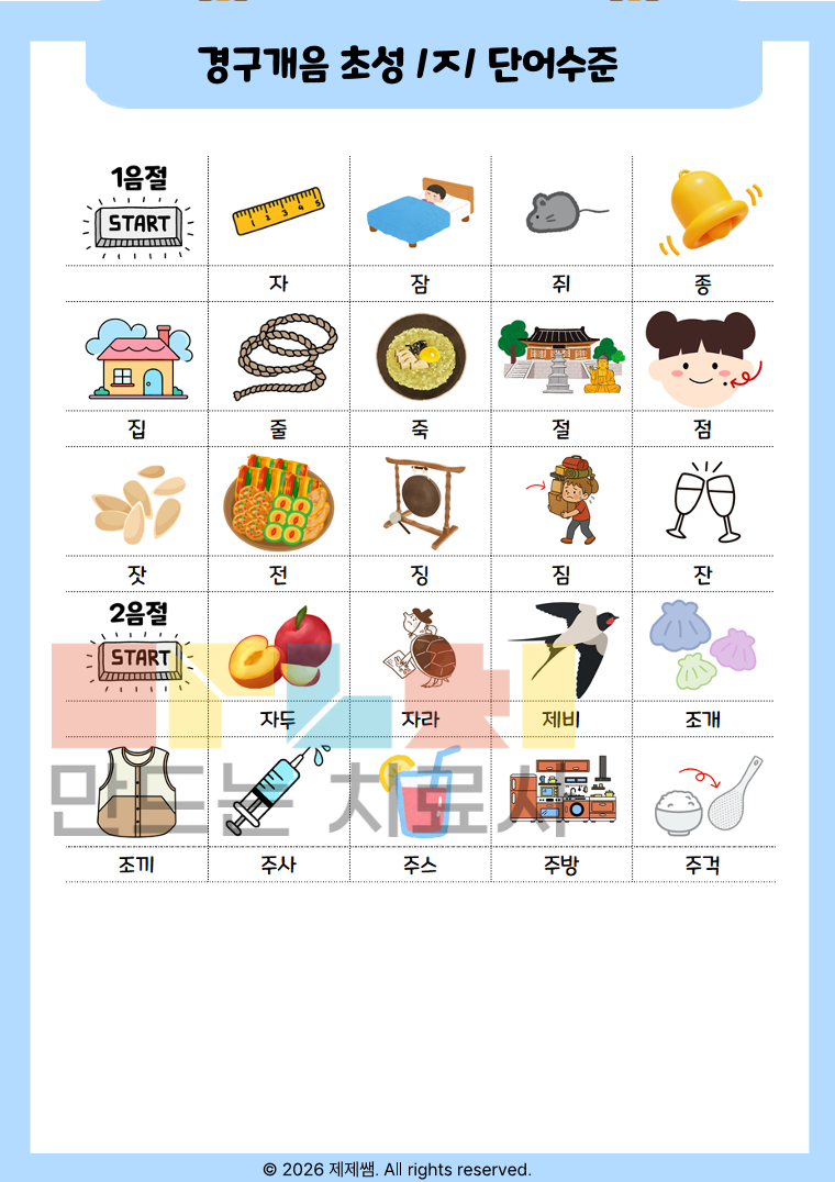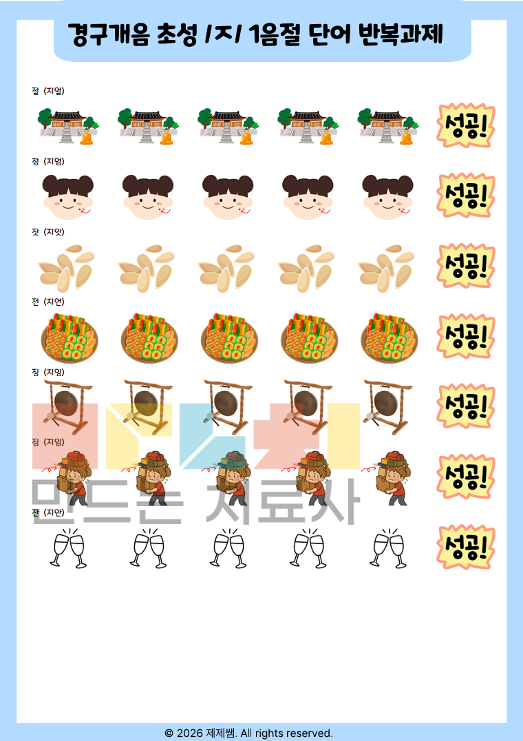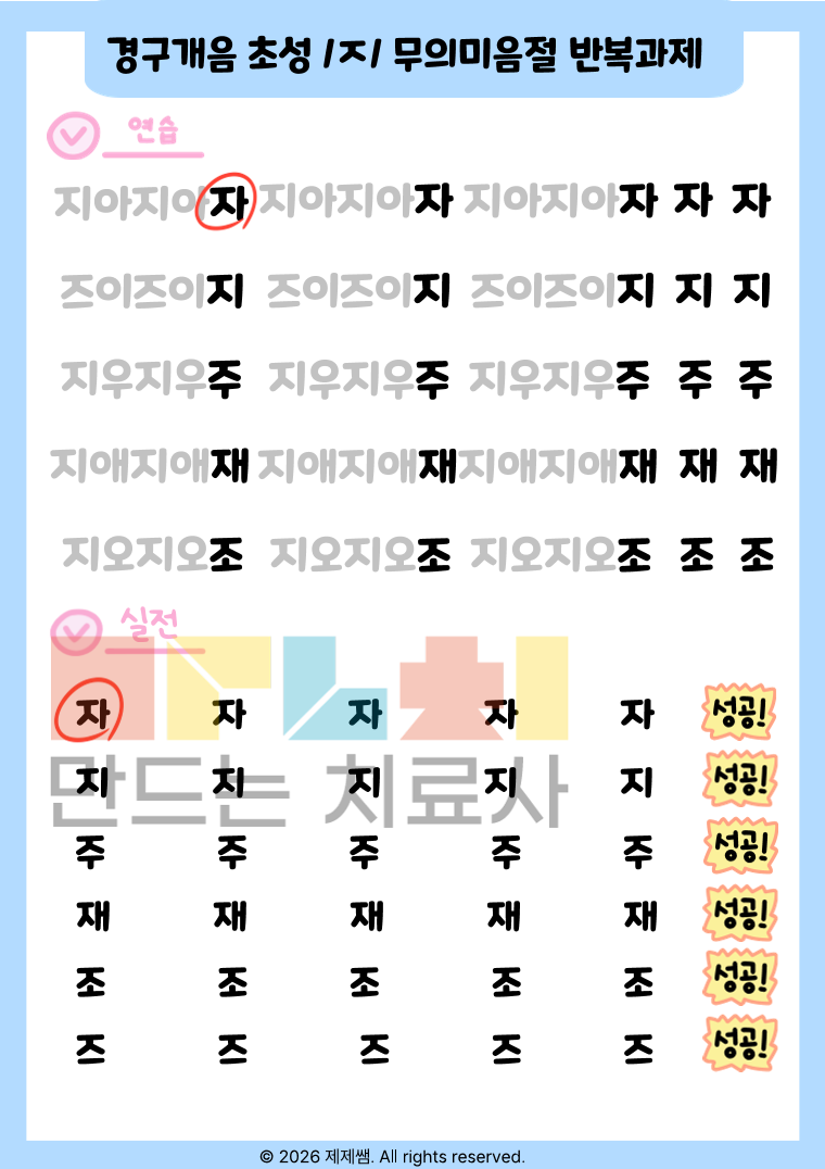 📌 자료 소개 경구개음 초성 /ㅈ/ 발음이 어려운 아동을 위한 단계별 조음 훈련 자료입니다. 무의미음절 반복부터 시작하여 1음절 → 2음절 → 3음절 이상 단어까지 점진적으로 확장하도록 구성되어 있어 기초 조음 안정화부터 일반화 단계까지 활용 가능합니다. 📌 이런 아이에게 추천해요 /ㅈ/을 ㄷ, ㅅ 등으로 대치하는 아동 단어 수준에서 정확도가 불안정한 아동 반복 연습이 필요한 조음 지연 아동 음절 길이가 늘어나면 오류가 증가하는 경우 📌 자료 구성 특징 ✔ 무의미음절 반복으로 정확한 위치 고정 훈련 ✔ 음절수별 체계적 단어 배열 ✔ 반복 과제로 자동화 유도 ✔ 시각적 그림 제시로 의미 연결 강화 ✔ 성공 표시 시스템으로 동기 유발 📌 활용 방법 치료실 개별수업용 가정 연습 과제용 정확도 체크 및 기록용 자료로 활용 가능