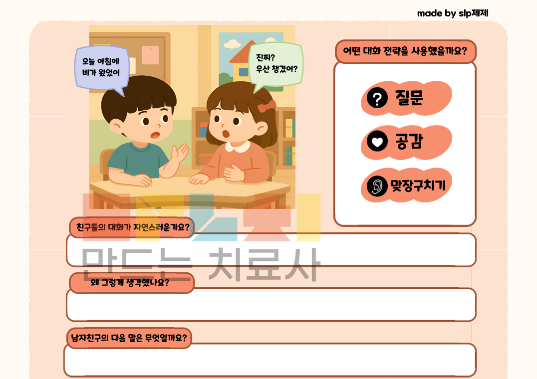 📘 우리의 대화가 이어지는지 맞춰줘 대화는 하고 있지만… 정말 “이어지고” 있을까요? 이 자료는 아이들이 대화의 자연스러움을 스스로 판단하고, 어떻게 말해야 대화가 이어지는지 배우는 화용 언어 훈련 자료입니다. 💡 이런 아이에게 추천해요 ✔ 자기 말만 하고 주제를 자주 바꾸는 아이 ✔ 친구 말에 엉뚱하게 대답하는 아이 ✔ 질문·공감 표현이 어려운 아이 ✔ 대화가 자주 끊기는 아이 ✔ ASD / 사회적 의사소통 어려움이 있는 아동 📚 활동 구성 ① 그림 상황 관찰하기 인물의 표정, 말의 분위기, 상황 맥락 파악 ② 대화 전략 선택하기 질문 공감 맞장구 ③ 대화 자연스러움 판단하기 “이 대화는 이어지고 있을까?” 이유 설명까지 함께 연습 ④ 이어질 말 생각하기 대화를 자연스럽게 이어갈 수 있는 문장 만들기 🎯 기대 효과 ✨ 대화 맥락 유지 능력 향상 ✨ 타인의 말 이해 및 반응 훈련 ✨ 사회적 추론 능력 강화 ✨ 실제 또래 대화에 적용 가능 👩⚕️ 치료 현장에서 이렇게 활용하세요 개별 화용 치료 ASD 사회성 수업 초등 저학년 사회성 그룹 또래 관계 지도 활동 📌 자료 특징 ✔ 한 눈에 이해되는 그림 상황 ✔ 단계적 사고 구조 ✔ 전략 개념 정리 포함 ✔ 치료사가 바로 사용할 수 있는 구성