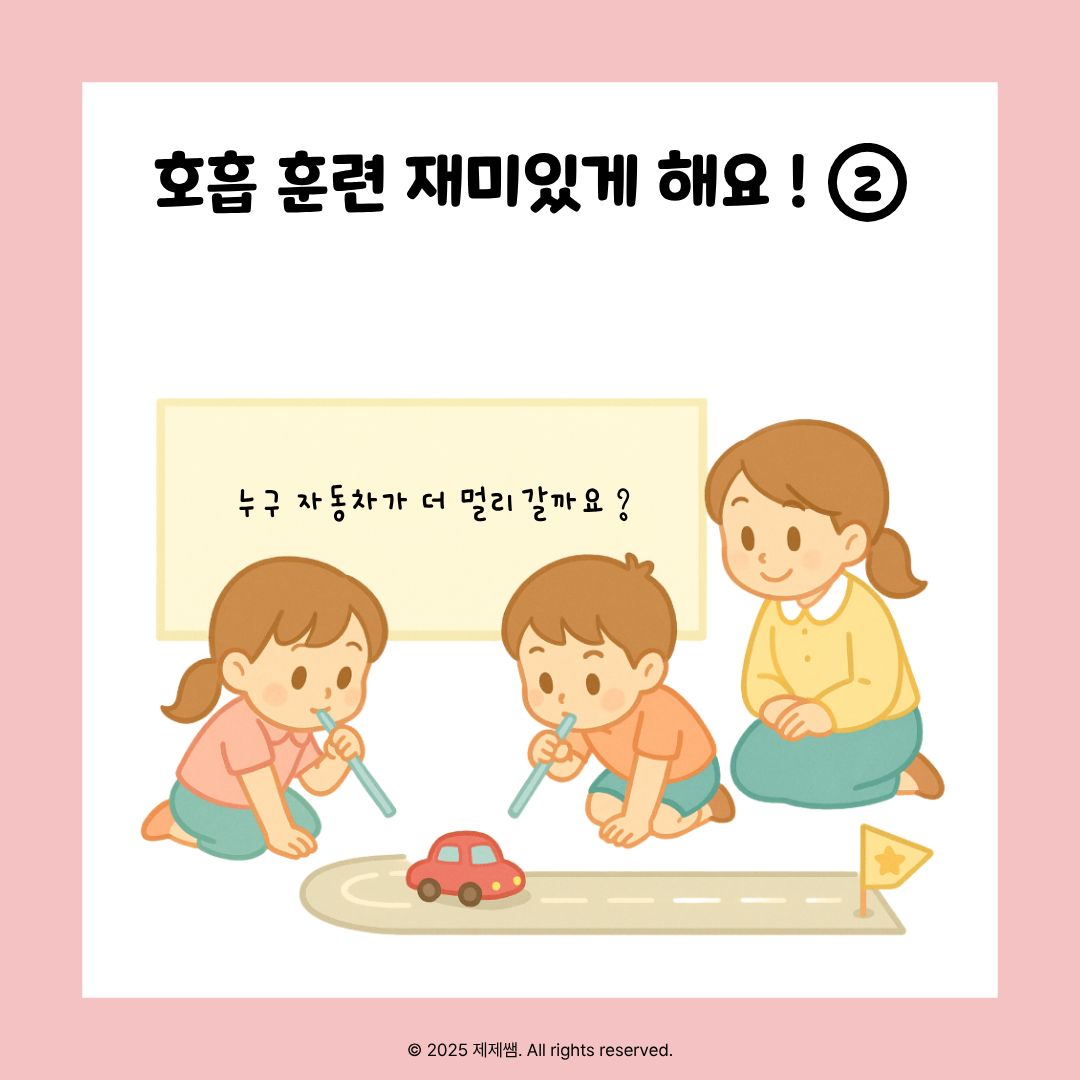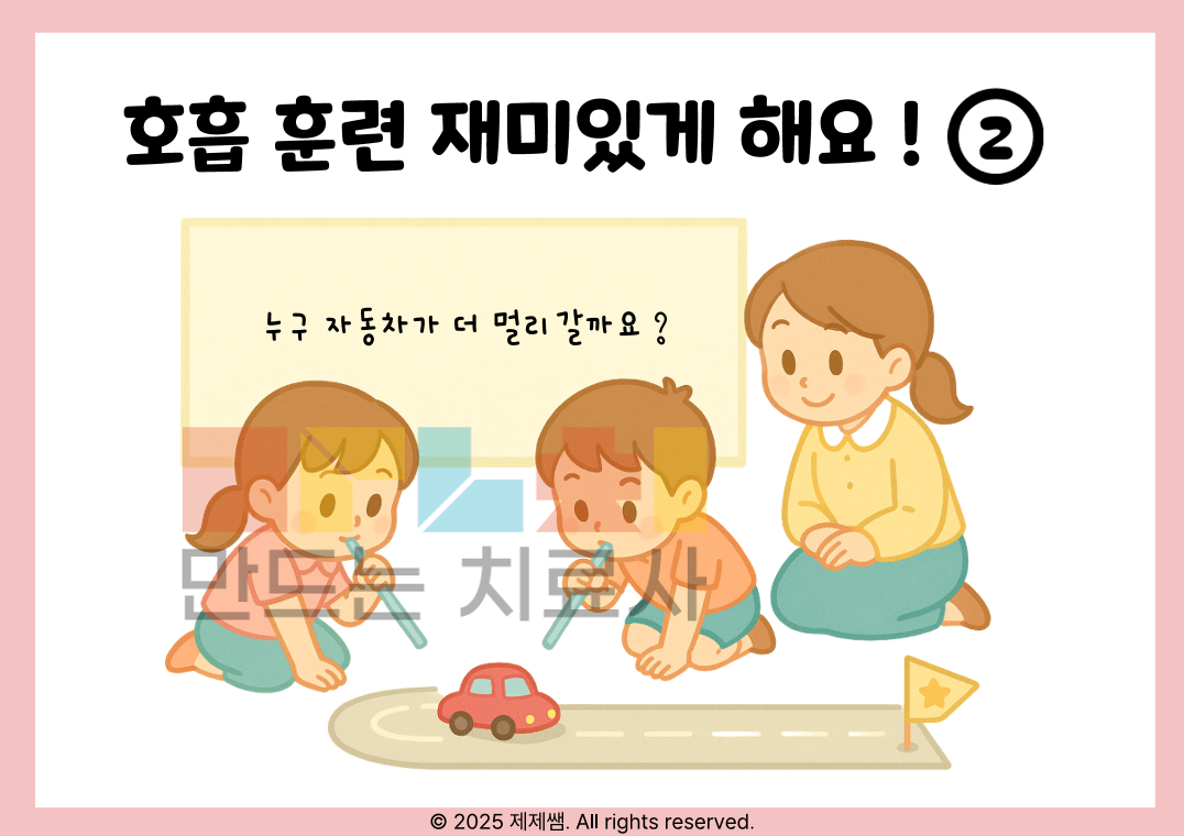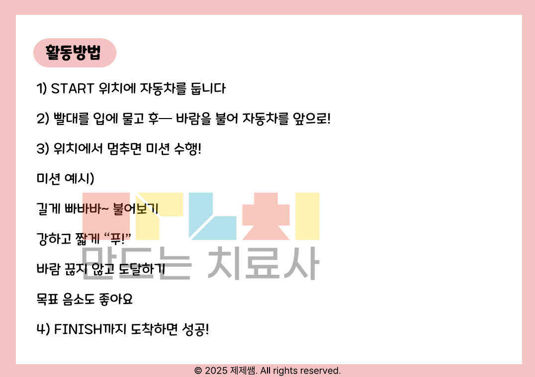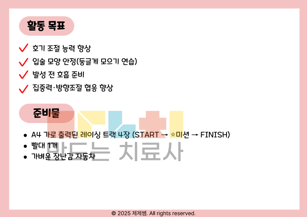 🏁 호흡 훈련 재미있게 해요! ② 레이싱 트랙 빨대 불기 활동지 “누가 자동차를 더 멀리 보낼까요?” 🚗💨 경쟁 요소를 더한 호흡 훈련 놀이! 📌 이런 친구들에게 추천해요! 빨대 불기 활동에 흥미가 떨어진 아동 호기 지속 시간이 짧은 아동 방향 조절이 어려운 아동 동기 유발이 필요한 아동 놀이 + 경쟁 요소가 들어가서 집중도가 확 올라가요 🔥 🎯 활동 목표 ✔ 호기 조절 능력 향상 ✔ 입술 둥글게 모으기 연습 ✔ 발성 전 호흡 준비 ✔ 집중력 및 방향 조절 협응 향상 🧸 활동 방법 1️⃣ START 위치에 자동차를 놓아요. 2️⃣ 빨대를 입에 물고 “후~” 불어 자동차를 앞으로! 3️⃣ 미션 지점에서 멈추면 미션 수행 🎯 미션 예시 길게 “빠아아~” 불어보기 강하고 짧게 “푸!” 바람 끊지 않고 도달하기 목표 음소 발성하기 4️⃣ FINISH 도착하면 성공! 🎉 📦 구성 A4 가로 레이싱 트랙 3종 (기본 트랙 / 별 미션 트랙 / 곡선 트랙) START / FINISH 구간 디자인 사용 안내 페이지 포함 ✔ 컬러 인쇄용 ✔ 라미네이팅 후 반복 사용 가능 ✔ 개인치료 / 2인 경쟁 활동 모두 활용 가능 💡 이 자료의 강점 ✨ 단순 불기 → 목표 기반 과제화 ✨ 지속 호기 vs 강한 호기 훈련 가능 ✨ 미션 삽입으로 치료 목표 확장 가능 ✨ 워밍업용 / 메인활동용 모두 사용 가능 특히 1탄(동물 먹이주기)과 함께 사용하면 난이도 단계화가 자연스럽게 이어져요 👍 👩🏻⚕️ 치료실 바로 적용 준비물은 ✔ 빨대 ✔ 가벼운 장난감 자동차 끝이에요! 아이들이 “또 하자!”라고 하는 호흡 훈련 자료예요 🚗💨