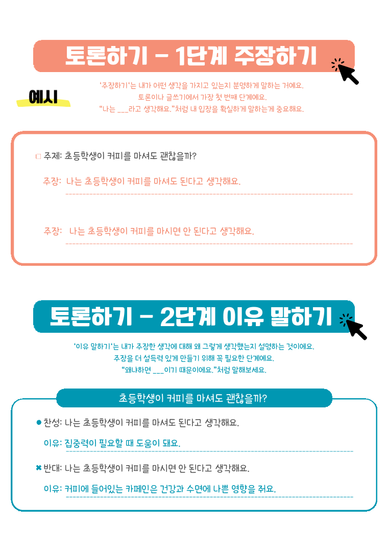 본 활동지는 생각을 조리 있게 꺼내는데 서툰 대상자들을 위한 '생각 정리 지도'가 될 수 있도록 5단계로 구성했습니다. 단계 별 활동을 통해 막연한 주장에 힘을 싣는 법을 배우고, 상대의 의견을 존중하며 대화하는 전략적인 소통 방식을 자연스럽게 익힐 수 있습니다. 단순한 말하기를 넘어 논리적인 담화 구조를 익히고 싶은 대상자들에게 활용할 수 있습니다.