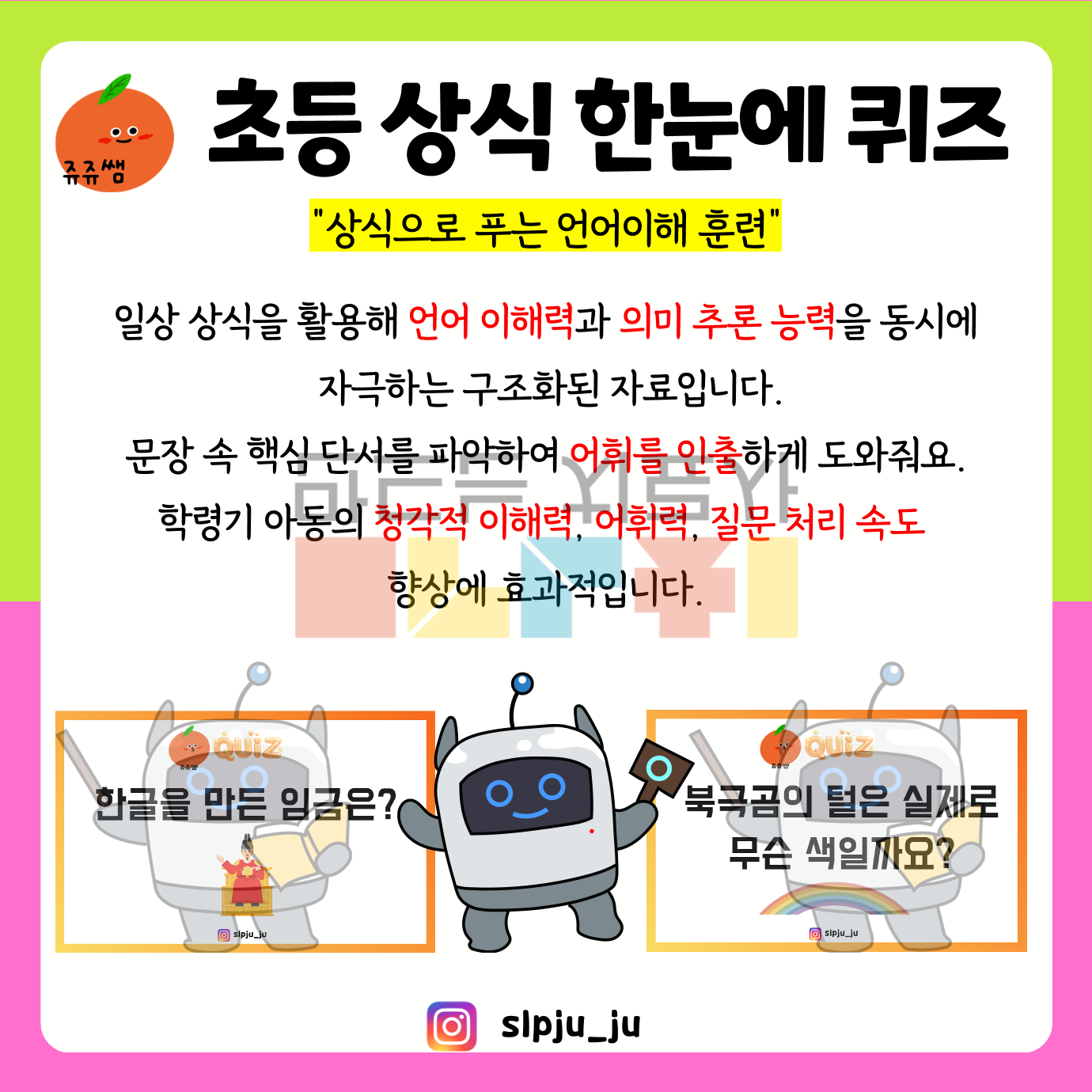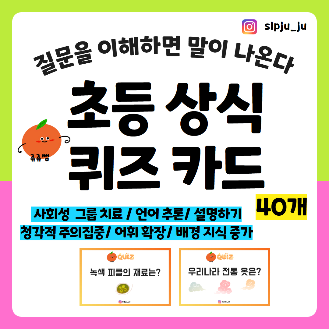 안녕하세요 쥬쥬쌤입니다. 일상 상식을 활용해 언어 이해력과 의미 추론 능력을 동시에 자극하는 구조화된 자료입니다. 문장 속 핵심 단서를 파악하여 어휘를 인출하게 도와줘요. 학령기 아동의 청각적 이해력, 어휘력, 질문 처리 속도 향상에 효과적입니다.