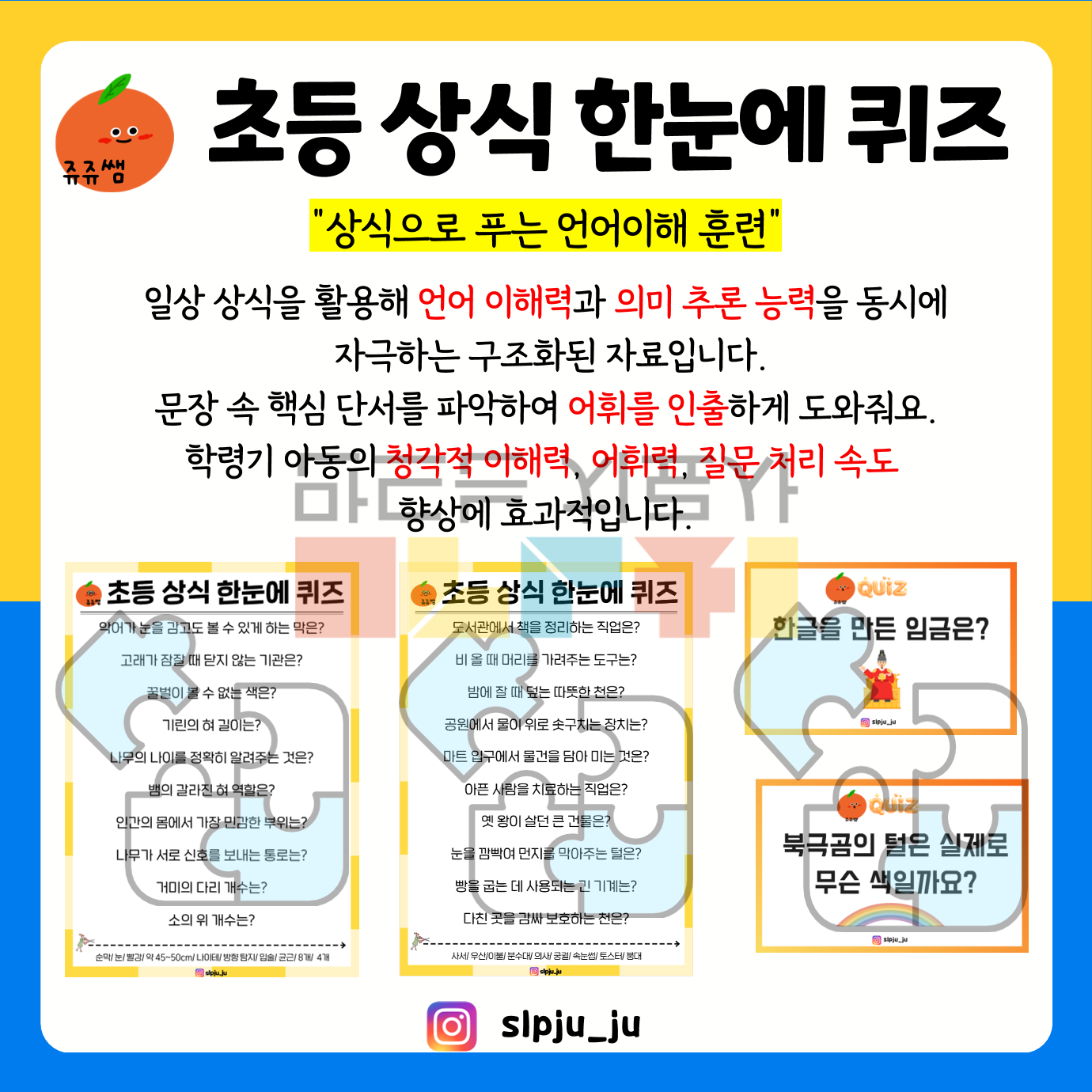 안녕하세요 쥬쥬쌤입니다. 일상 상식을 활용해 언어 이해력과 의미 추론 능력을 동시에 자극하는 구조화된 자료입니다. 문장 속 핵심 단서를 파악하여 어휘를 인출하게 도와줘요. 학령기 아동의 청각적 이해력, 어휘력, 질문 처리 속도 향상에 효과적입니다.
