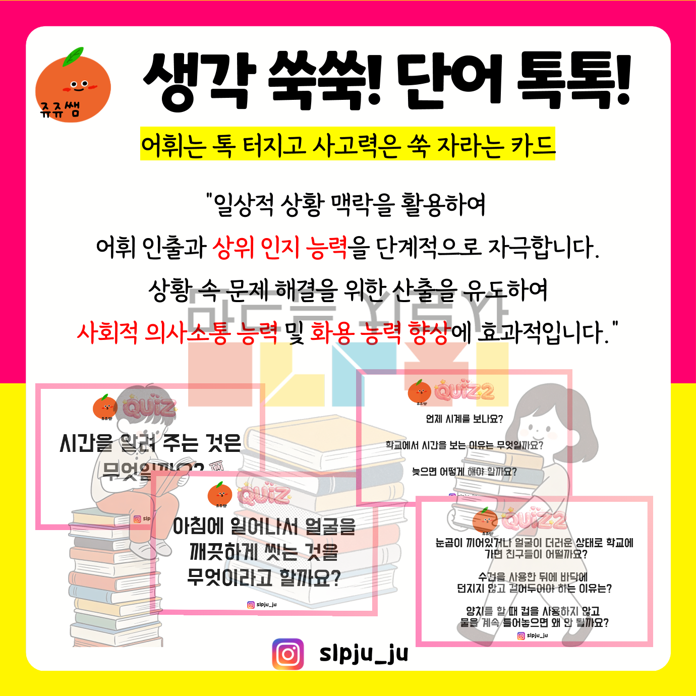 안녕하세요 쥬쥬쌤입니다. 일상적 상황 맥락을 활용하여 어휘 인출과 상위 인지 능력을 단계적으로 자극합니다. 상황 속 문제 해결을 위한 산출을 유도하여 사회적 의사소통 능력 및 화용 능력 향상에 효과적입니다