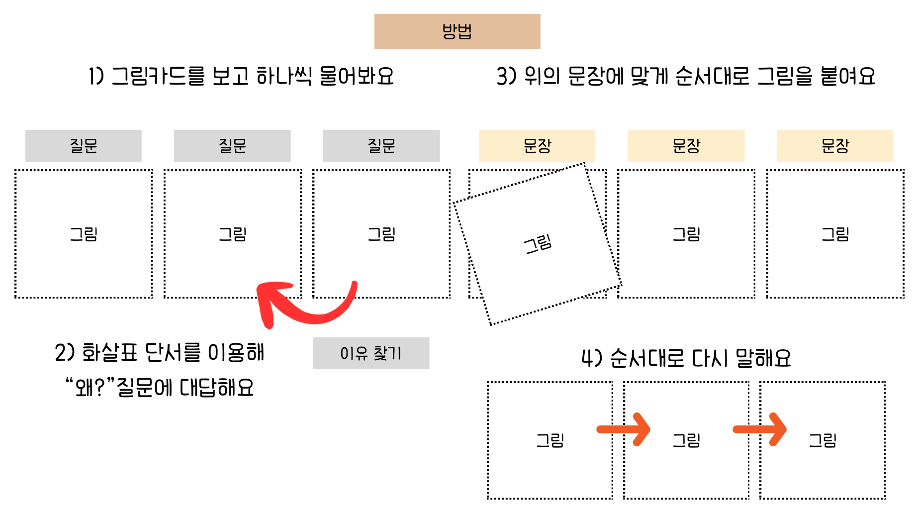 3컷 순서 그림카드를 이용하여 질문에 대답하고 순서대로 말하는 연습을 하기 위해 제작하였습니다.