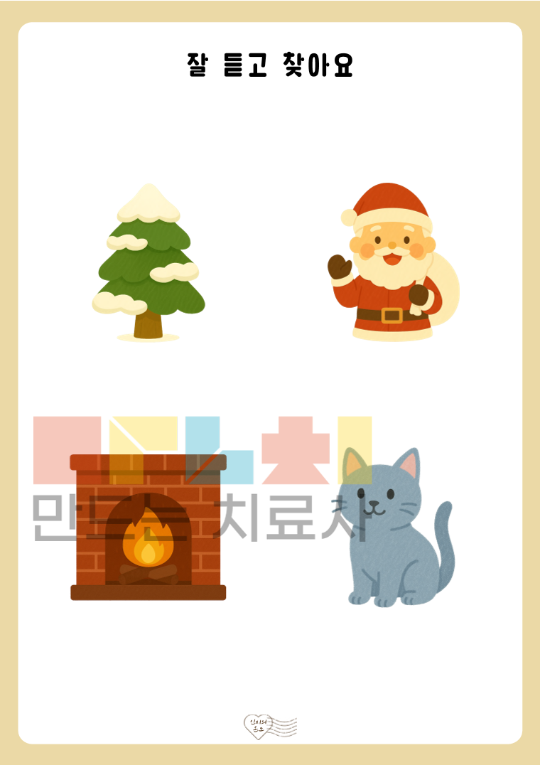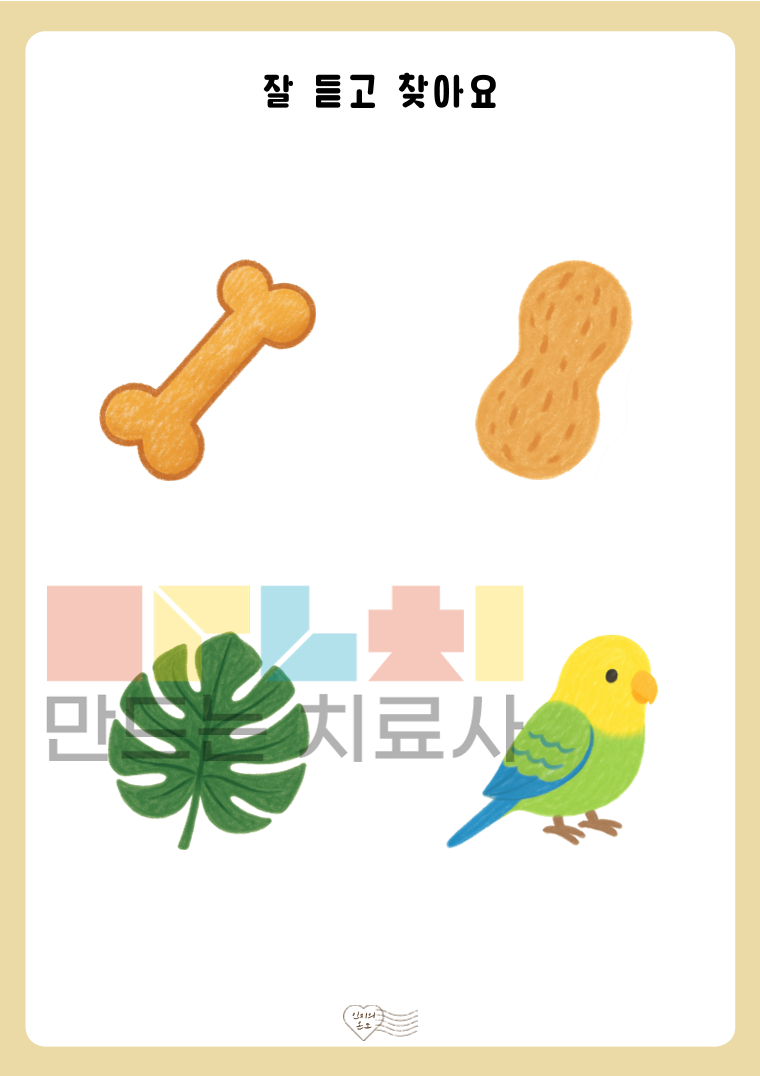 안녕하세요. 인지의 온도입니다. 본 자료는 ‘듣고 고르기(기본)’ 활동지로, 4개의 그림 중에서 2개 또는 3개의 낱말을 듣고 찾아보는 활동으로 구성되어 있습니다. 제시된 낱말을 듣고 해당 그림을 찾아보는 활동을 통해 청각주의력과 어휘 이해 능력을 기를 수 있습니다. ‘잘 듣고 찾아요’ 시리즈는 기초–기본 난이도로 구성되었습니다. 교사가 제시한 낱말을 잘 듣고 그림을 선택하는 과정을 통해 청각적 주의 집중, 어휘 이해, 들은 정보를 기억하고 처리하는 능력을 기를 수 있습니다. ◎표지1, 안내서1, 활동지30(그림카드15장-지시문15장) * 지시문에는 아동 반응을 체크할 수 있는 체크리스트가 함께 있습니다.