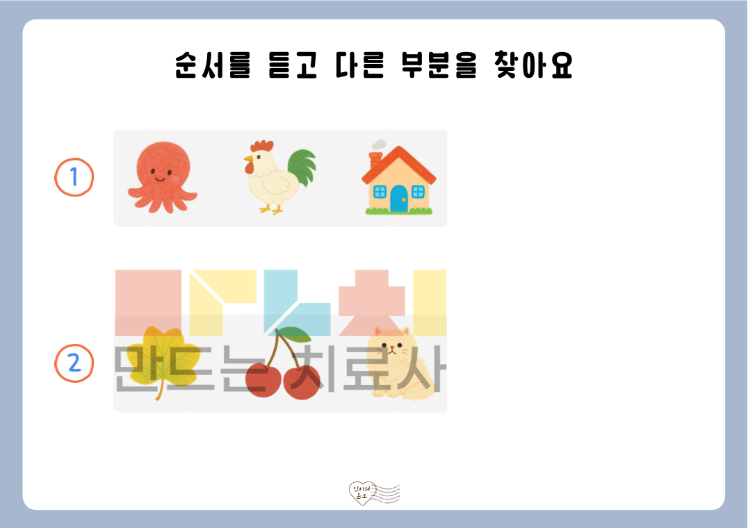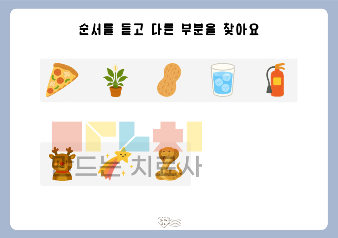 안녕하세요. 인지의 온도입니다. 본 자료는 ‘듣고 순서 비교하기’ 활동지로, 제시된 낱말의 순서를 듣고 순서상 다른 부분을 찾아보는 활동으로 구성되어 있습니다. 낱말을 들으며 순서를 비교하는 과정을 통해 청각 주의력, 순서 처리 능력, 정보 처리 능력을 기를 수 있습니다. ◎표지1, 안내서1, 활동지40(3~5개: 장당 2문항 5장, 6~10개: 장당 1문항 5장)