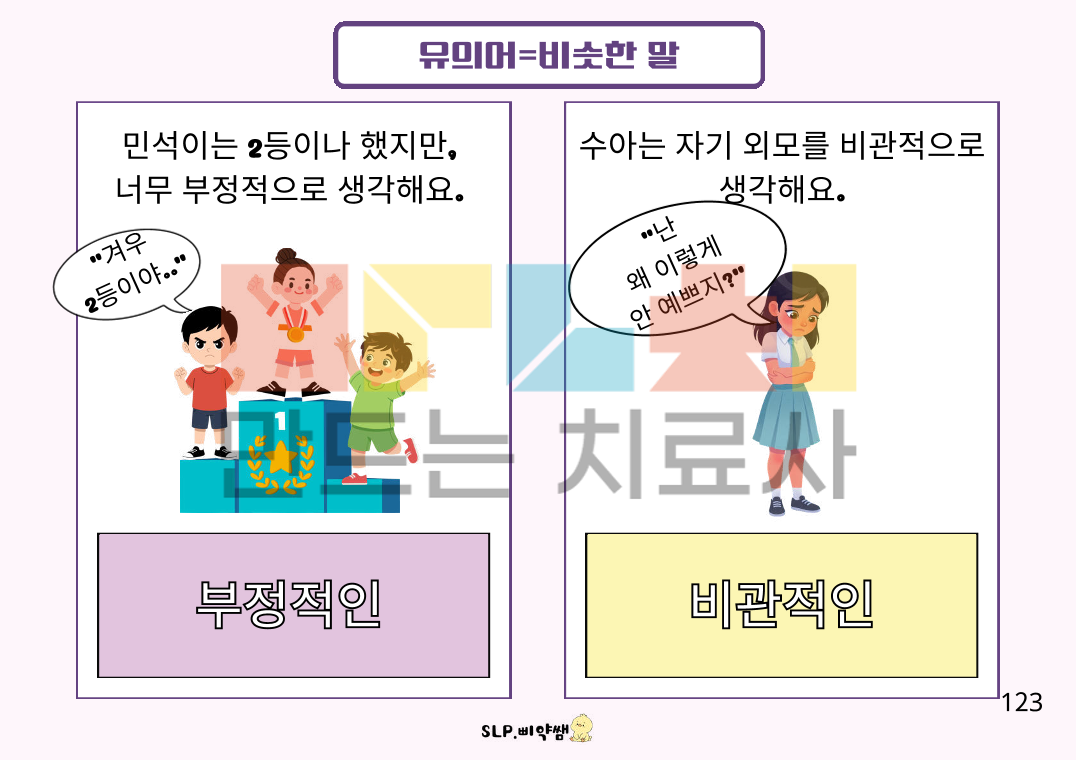 안녕하세요, 삐약쌤입니다. 우리 아이들이 반의어는 생각보다 잘 알고 있는데, 유의어를 어려워 하는 경우가 많습니다. LSSC평가를 돌리면서 더 여실히 느끼는 점이기도하구요. 이 유의어 어휘들은 아주 쉬운 단계의 어휘는 아닙니다. 관계나 감정등과 관련된 유의어 어휘들이기 때문에 유치원~초등1~2학년 수준의 어휘를 익힐 수 있는 친구들을 위해 마든 자료입니다. 구성은 이렇게 되어 있습니다. 1단계: 유의어 2-3개를 상황예시와 함께 익히기 2단계: 익혔던 유의어를 그림 상황예시를 보고 써보기 3단계: 정확한 사전적 의미를 알고, 나의 예를 들어보기 4단계: 익혔던 유의어를 기억해서 초성 힌트로 마무리 내용으로는 감정 유의어 행동, 생각, 상태 유의어 관계(상호작용) 유의어 를 포함하였습니다. 예시 자료를 보시면 어떤 내용인지 한 눈에 알 수 있어요^^ 아이들과 유용하게 쓸 수 있기를 바랍니다. <저작권 관련 공지> 1.본 자료의 모든 내용과 디자인은 삐약쌤에게 있으며, Canva의 라이센스 규정을 준수하여 제작하였습니다. 2.본 결과물은 다수의 요소를 조합하여 만든 '완성된 디자인'으로, 캔바의 순정 요소 하나만으로 구성된 디자인이 아님을 밝힙니다. 3.본 자료를 구매하신 고객님은 치료실, 학교, 가정 내에서 교육 및 치료 목적으로 인쇄하여 사용할 수 있습니다. 4.본 자료의 전체 또는 일부를 무단으로 복제, 수정하여 온/오프라인상에 재배포하거나 판매하는 행위는 엄격히 금지도비니다.(캔바의 개별 디자인 요소를 따로 추출하여 상업적으로 사용하는 것은 캔바 이용 약관 위반입니다.) 5.저작권자의 허락 없이 무단 전재 및 재배퐇시, 저작권법에 따라 민/형사상 책임을 질 수 있습니다.