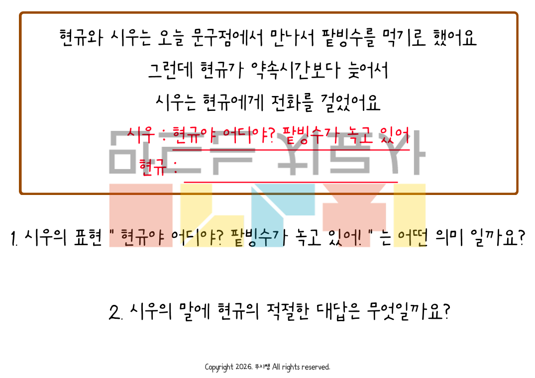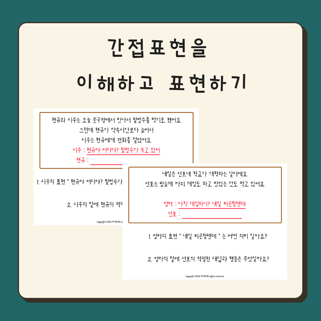 '간접표현을 이해하고 표현하기' 자료는 학령기 친구들과 함께 대화의 맥락을 이해하고 파악하여 간접표현에 적절하게 반응하고 표현하는 연습을 할 수 있는 활동지 입니다 페이지수 : 20페이지