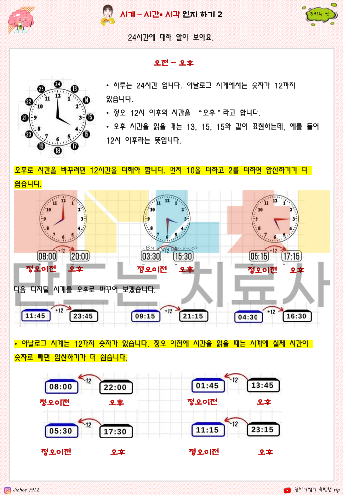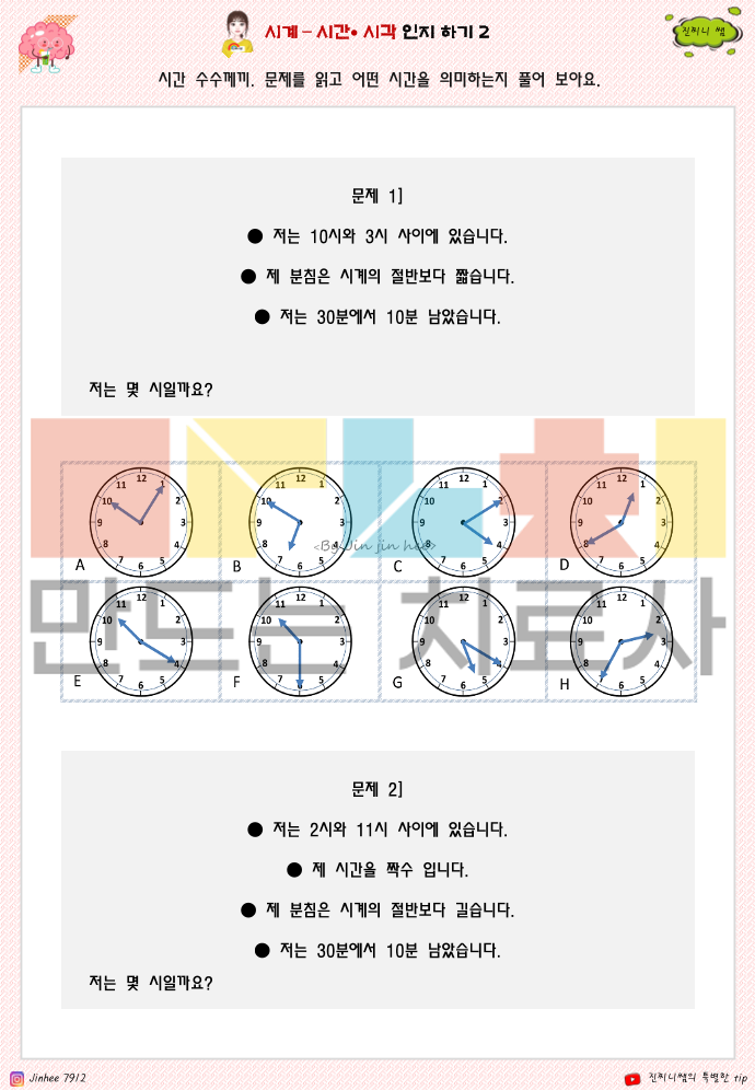 1️⃣ 시간 개념 이해 수준 -정시(○시) 읽을 수 있는지, 30분(○시 반) 개념을 이해하는지, 분 단위(10분, 20분 등) 확장이 가능한지, 시침과 분침의 역할을 구분하는지 👉 단순히 숫자를 읽는 것이 아니라 ‘시간의 구조’를 이해하고 있는지를 알 수 있습니다. 2️⃣ 시지각 + 주의집중 능력 -시계 바늘의 위치 차이를 구별하는 능력, 비슷한 시각 그림을 비교하는 능력, 작은 변화를 인식하는 시각 변별력 👉 이는 읽기, 수학 자리값, 도형 인지와도 연결됩니다. 3️⃣ 순서 개념과 시간 흐름 이해 -하루 일과를 시간 순서로 배열할 수 있는지, “지금–조금 후–나중”의 개념을 아는지, 시간에 맞춰 행동을 준비할 수 있는지 👉 학교생활, 등교 준비, 약속 지키기와 직접 연결됩니다. 4️⃣ 수 개념 확장 가능성 -5씩 건너뛰기 세기 가능 여부, 60분 구조 이해 여부, 시계 숫자를 통한 수 배열 이해 👉 이는 곱셈 개념, 단위 이해로 이어집니다. 5️⃣ 실생활 적용 능력 -이 자료를 통해 알 수 있는 핵심은 “아이가 시간을 실제 생활에서 사용할 준비가 되어 있는가?" 입니다. 예) 3시에 수업 시작 → 스스로 준비 가능한가 10분 남았다 → 기다릴 수 있는가 7시 반 → 아침 준비 시작 이해 가능한가? - “시계 인지는 단순히 시간을 읽는 학습이 아니라, 아이의 주의집중력, 시지각 능력, 수 개념, 순서 이해 능력을 함께 보는 중요한 영역입니다. 시간을 이해하면 약속을 지키고, 기다리고, 준비하는 힘이 자랍니다.”