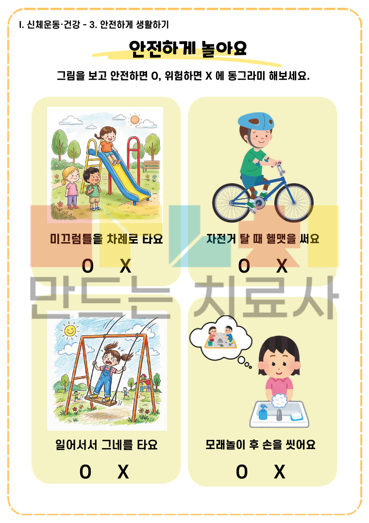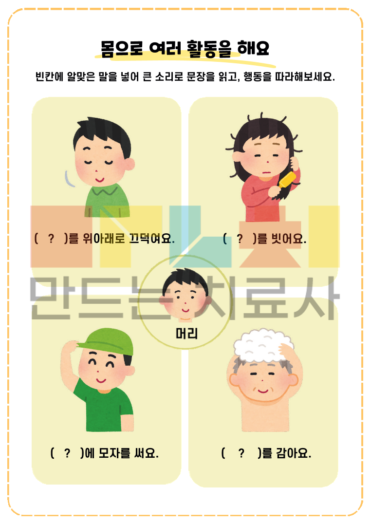 2019 누리과정 중 신체운동, 건강 영역을 바탕으로 구성한 워크북입니다. [ I. 신체운동·건강 ] 파트 2019 개정 누리과정 중 신체운동·건강 영역을 바탕으로 제작 일상생활과 밀접한 주제를 통해 자연스럽게 어휘와 표현력을 키울 수 있도록 구성 누리과정 교육목표에 맞게 생각하고 말하고 쓰는 활동 제공 <목차> 1. 신체활동 즐기기 1)내 몸을 알아요 2)몸으로 여러 활동을 해요 2. 건강하게 생활하기 1)내 몸과 주변을 깨끗이 해요 2)식사 예절을 지켜요 3)건강한 음식을 먹어요 4)음식에서 어떤 소리가 날까요? 5)내 몸의 배터리는 무슨 색깔일까요? 6)이럴 때는 어떻게 해야할까요? 3. 안전하게 생활하기 1)안전하게 놀아요 2)미디어를 바르게 사용해요 3)교통안전을 지켜요 4)위험할 때 도움을 요청해요